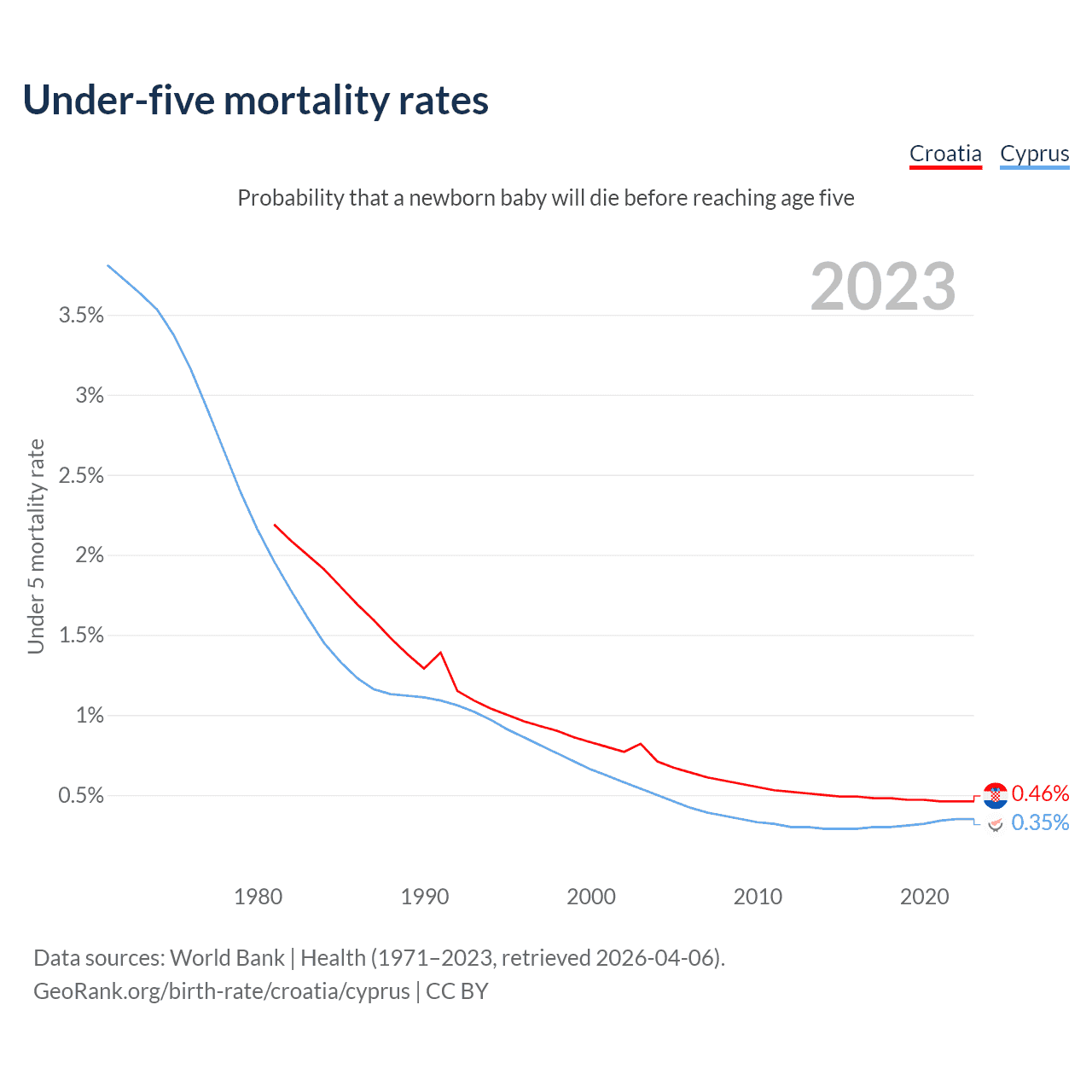 The chance that a newborn baby will die before reaching age five is 0.46% in Croatia and 0.35% in Cyprus. Above is a chart with historical data on under-five mortality rates.