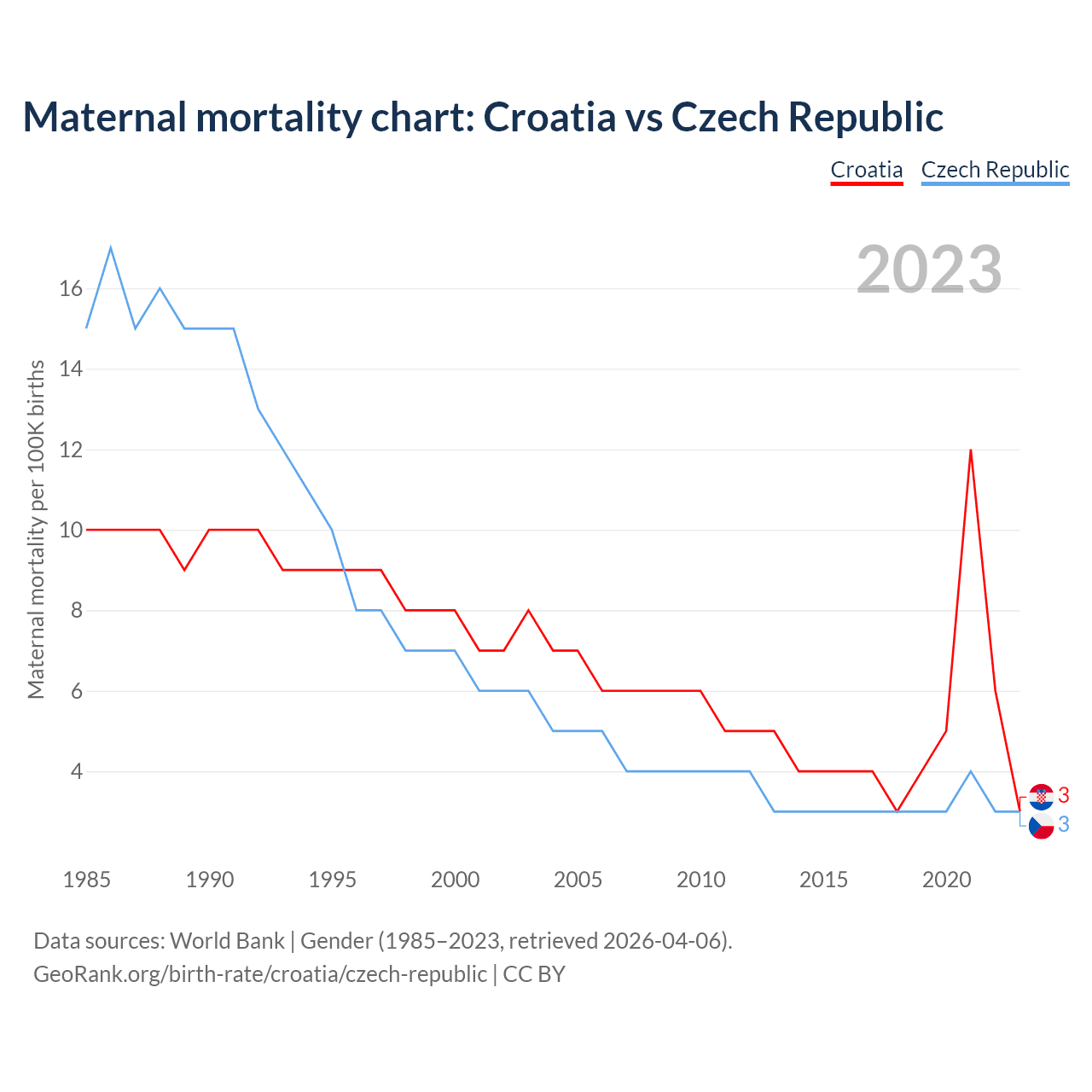 The maternal mortality rate, which is the probability of dying during childbirth or within 42 days of pregnancy termination, is 3 deaths per 100,000 live births in Croatia, compared to 3 deaths in the Czech Republic.