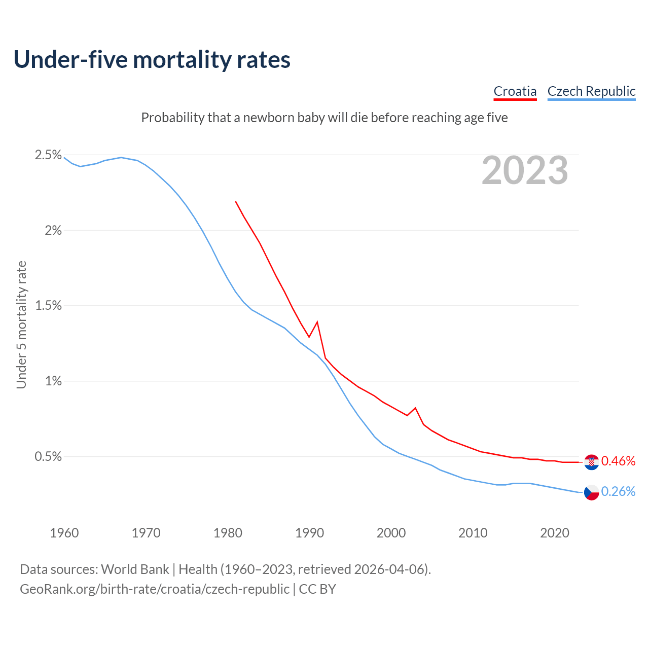 The chance that a newborn baby will die before reaching age five is 0.46% in Croatia and 0.26% in the Czech Republic. Above is a chart with historical data on under-five mortality rates.
