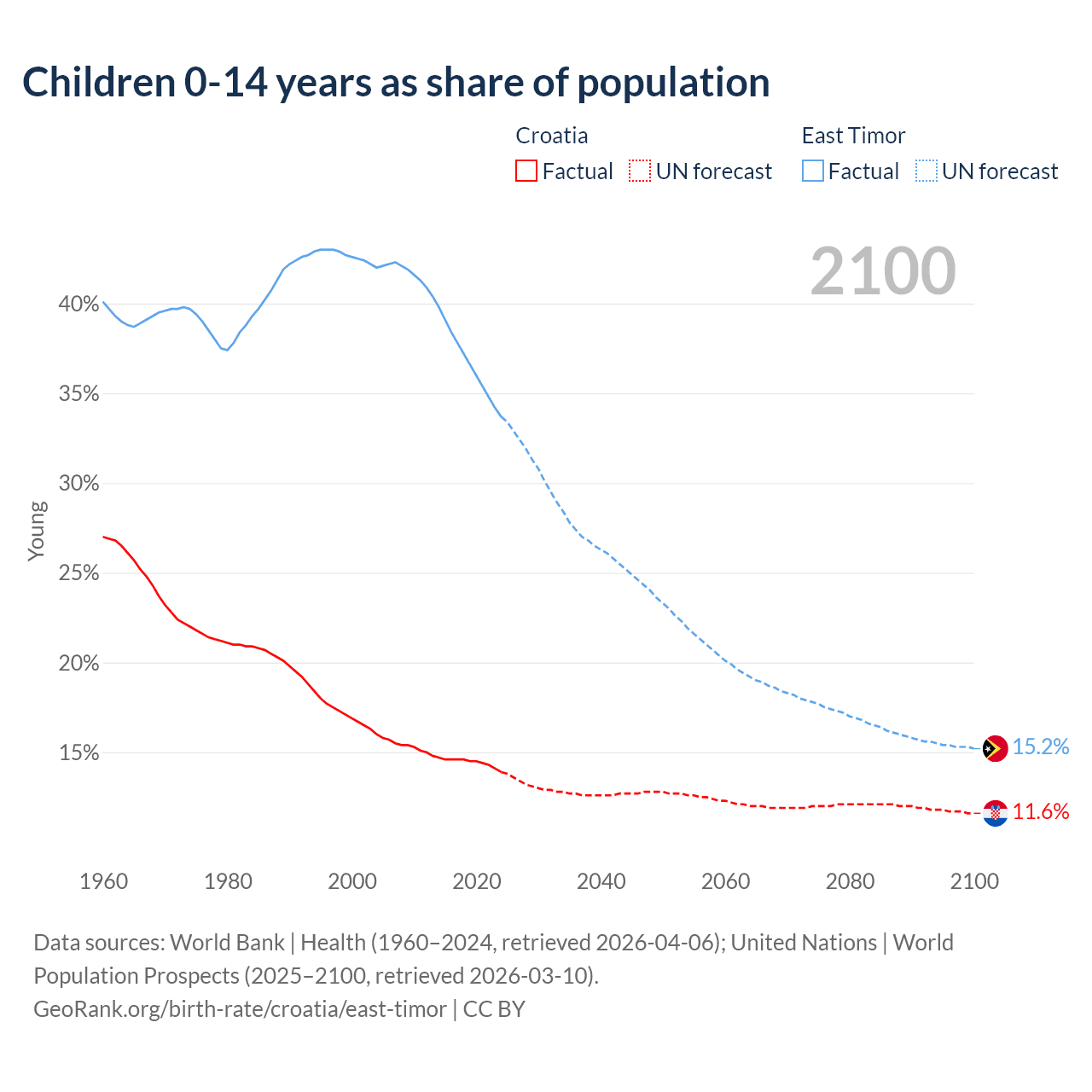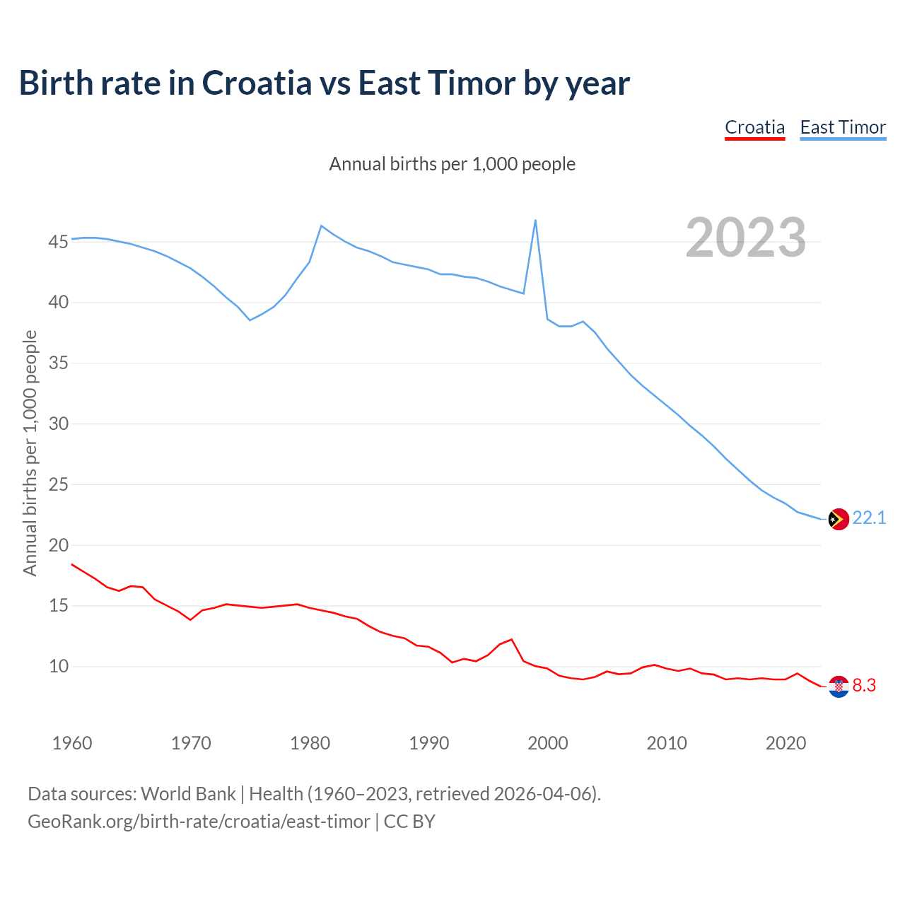 Croatia has an annual birth rate of 8.3 births per 1,000 people, compared to 22.1 for East Timor. The average number of children a woman is expected to have during her lifetime — the fertility rate, is 1.46 in Croatia and 2.71 in East Timor — 85.4% difference.