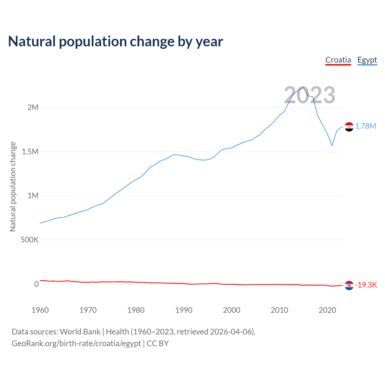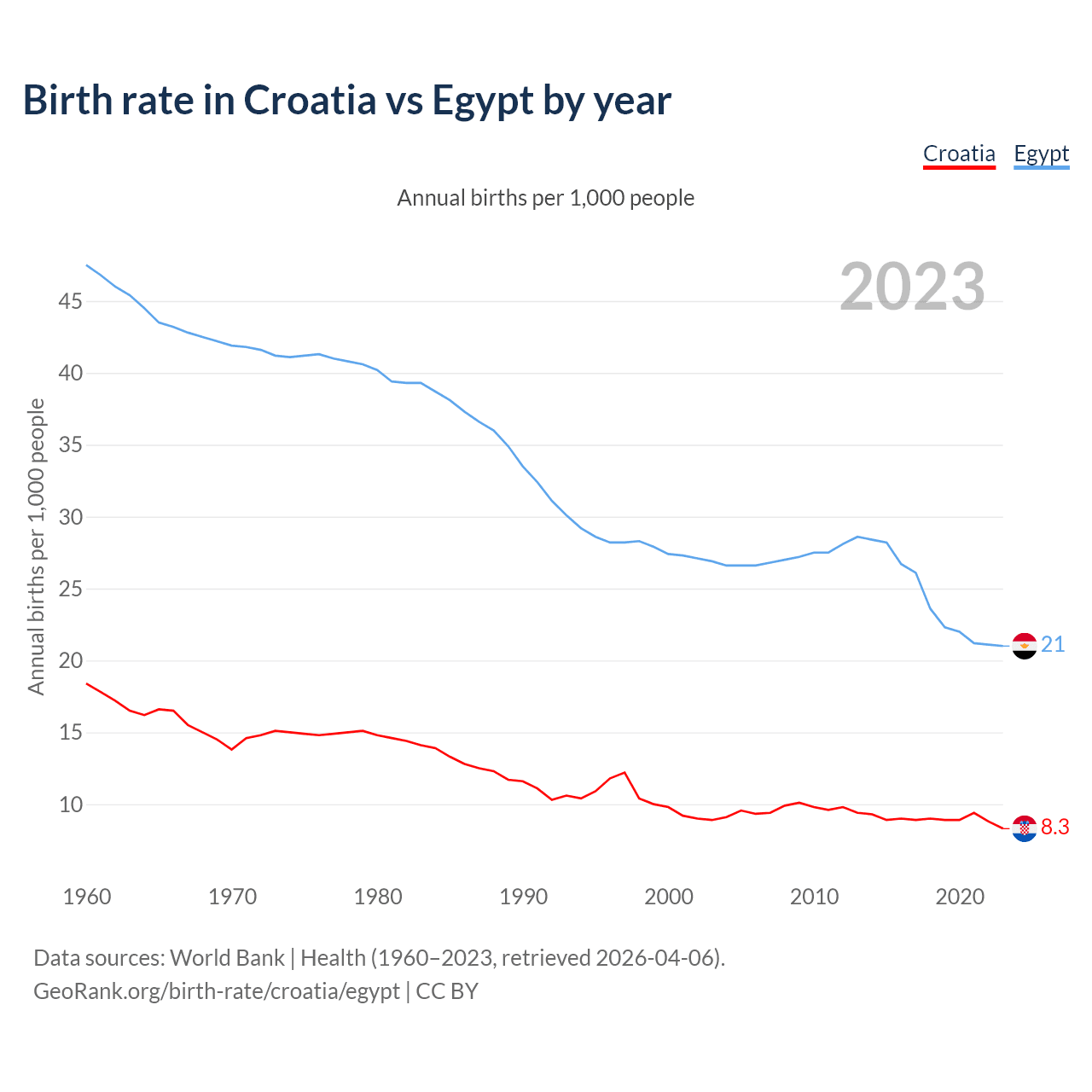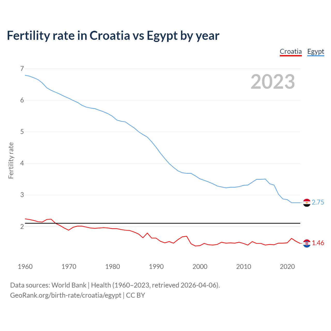 Croatia has an annual birth rate of 8.3 births per 1,000 people, compared to 21 for Egypt. The average number of children a woman is expected to have during her lifetime — the fertility rate, is 1.46 in Croatia and 2.75 in Egypt — 88.4% difference.