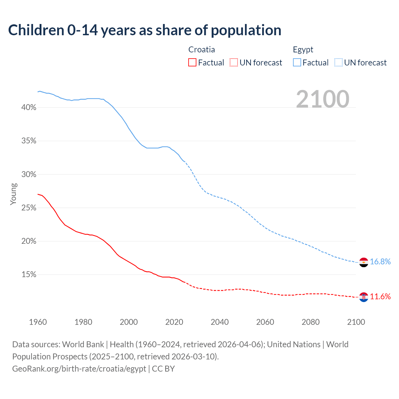 According to the latest available data on birth rates, the fertility rate in Croatia was 1.46 children per woman in 2023, compared to 2.75 in Egypt in 2023. The replacement level is considered to be 2.1 children per woman.