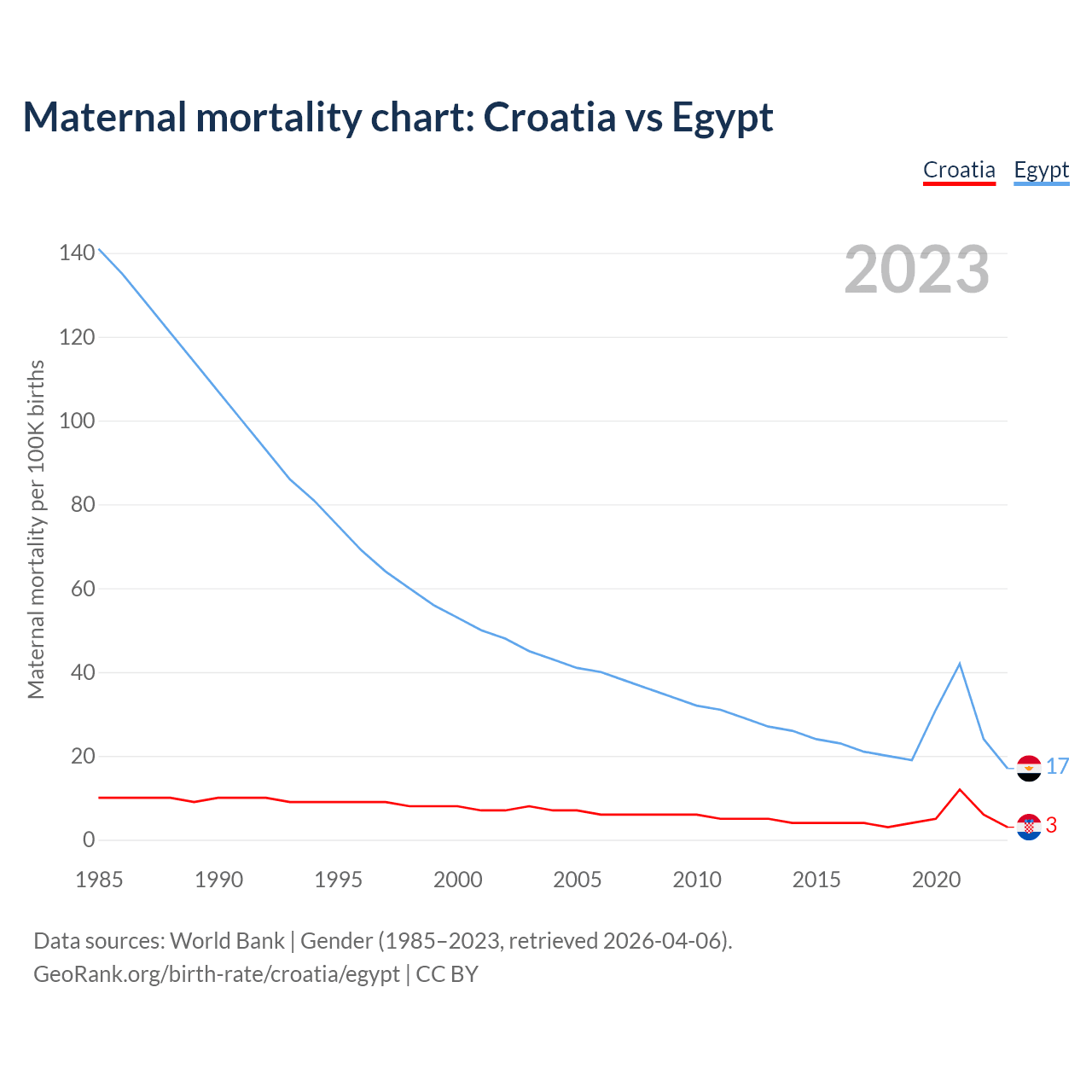 The maternal mortality rate, which is the probability of dying during childbirth or within 42 days of pregnancy termination, is 3 deaths per 100,000 live births in Croatia, compared to 17 deaths in Egypt.