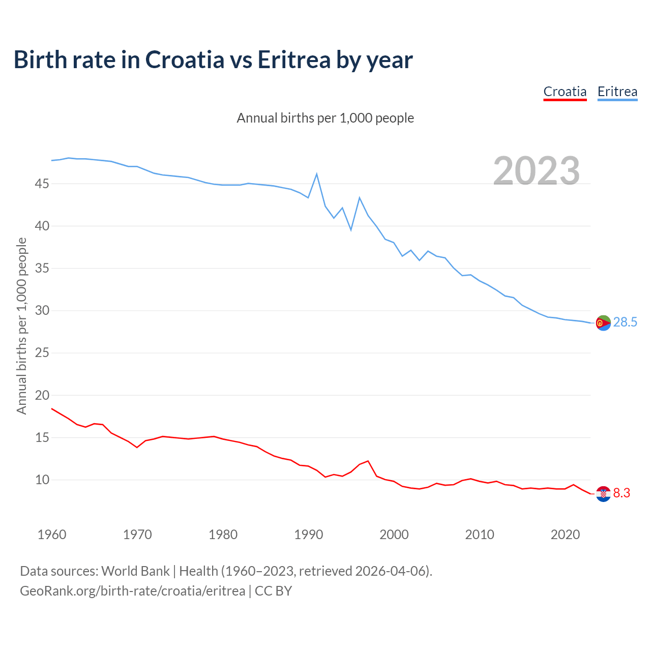 Croatia has an annual birth rate of 8.3 births per 1,000 people, compared to 28.5 for Eritrea. The average number of children a woman is expected to have during her lifetime — the fertility rate, is 1.46 in Croatia and 3.71 in Eritrea — 154.3% difference.