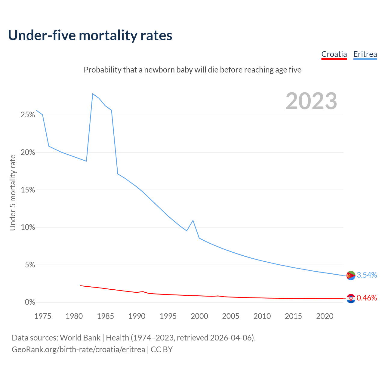 The chance that a newborn baby will die before reaching age five is 0.46% in Croatia and 3.54% in Eritrea. Above is a chart with historical data on under-five mortality rates.
