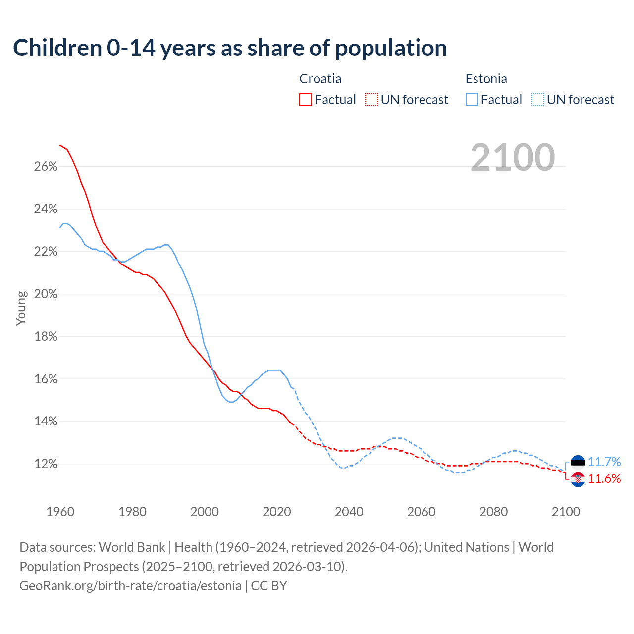 According to the latest available data on birth rates, the fertility rate in Croatia was 1.46 children per woman in 2023, compared to 1.31 in Estonia in 2023. The replacement level is considered to be 2.1 children per woman.