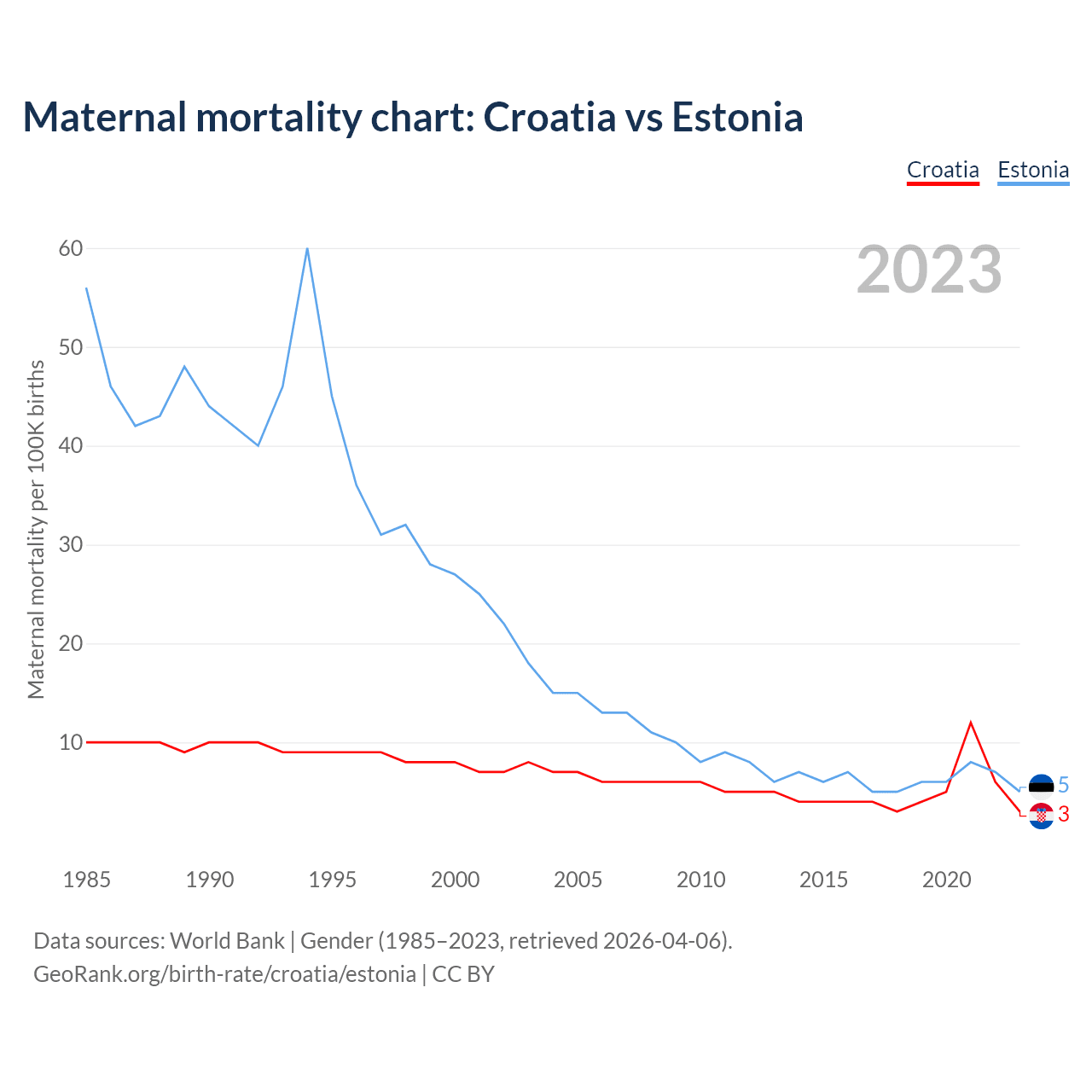 The maternal mortality rate, which is the probability of dying during childbirth or within 42 days of pregnancy termination, is 3 deaths per 100,000 live births in Croatia, compared to 5 deaths in Estonia.