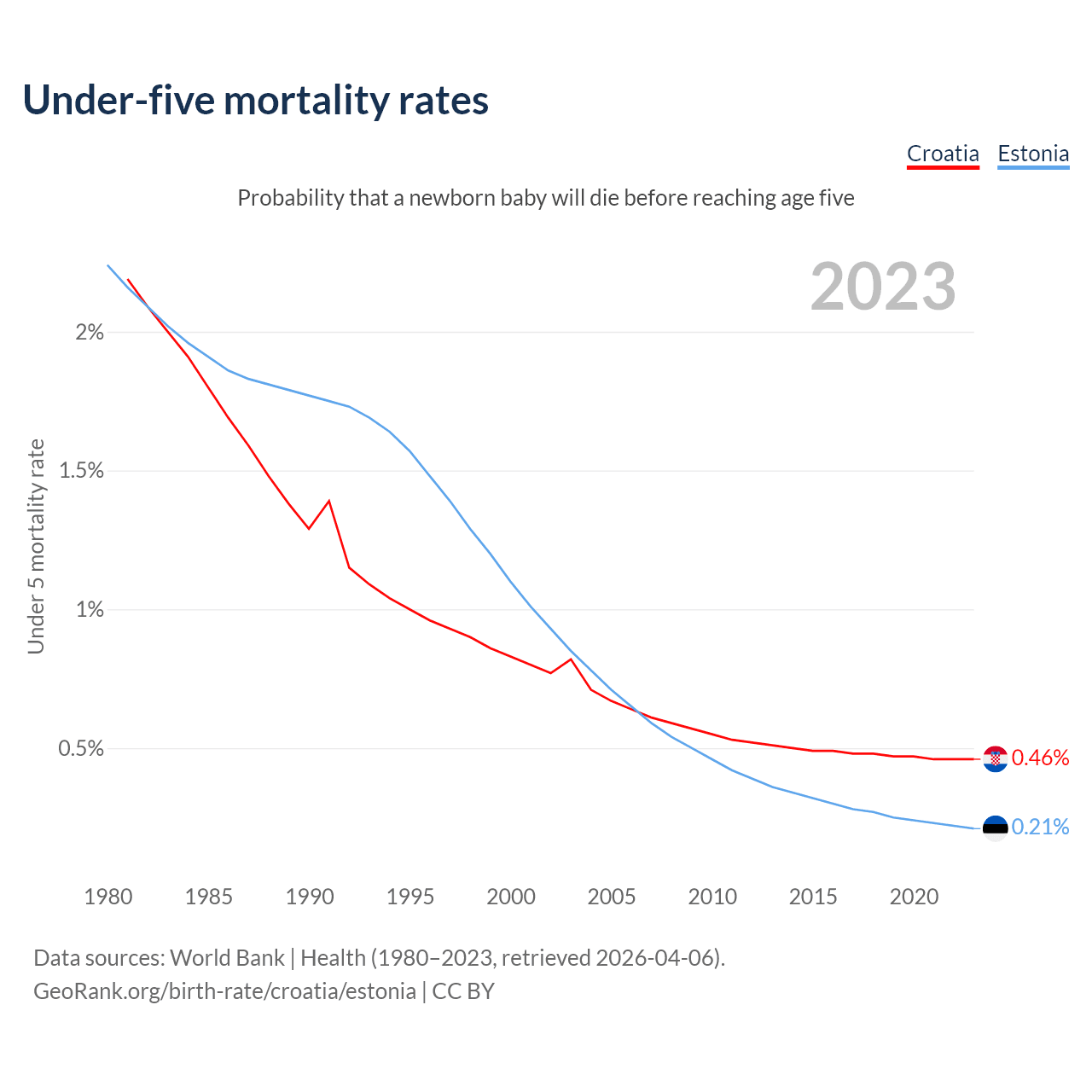 The chance that a newborn baby will die before reaching age five is 0.46% in Croatia and 0.21% in Estonia. Above is a chart with historical data on under-five mortality rates.