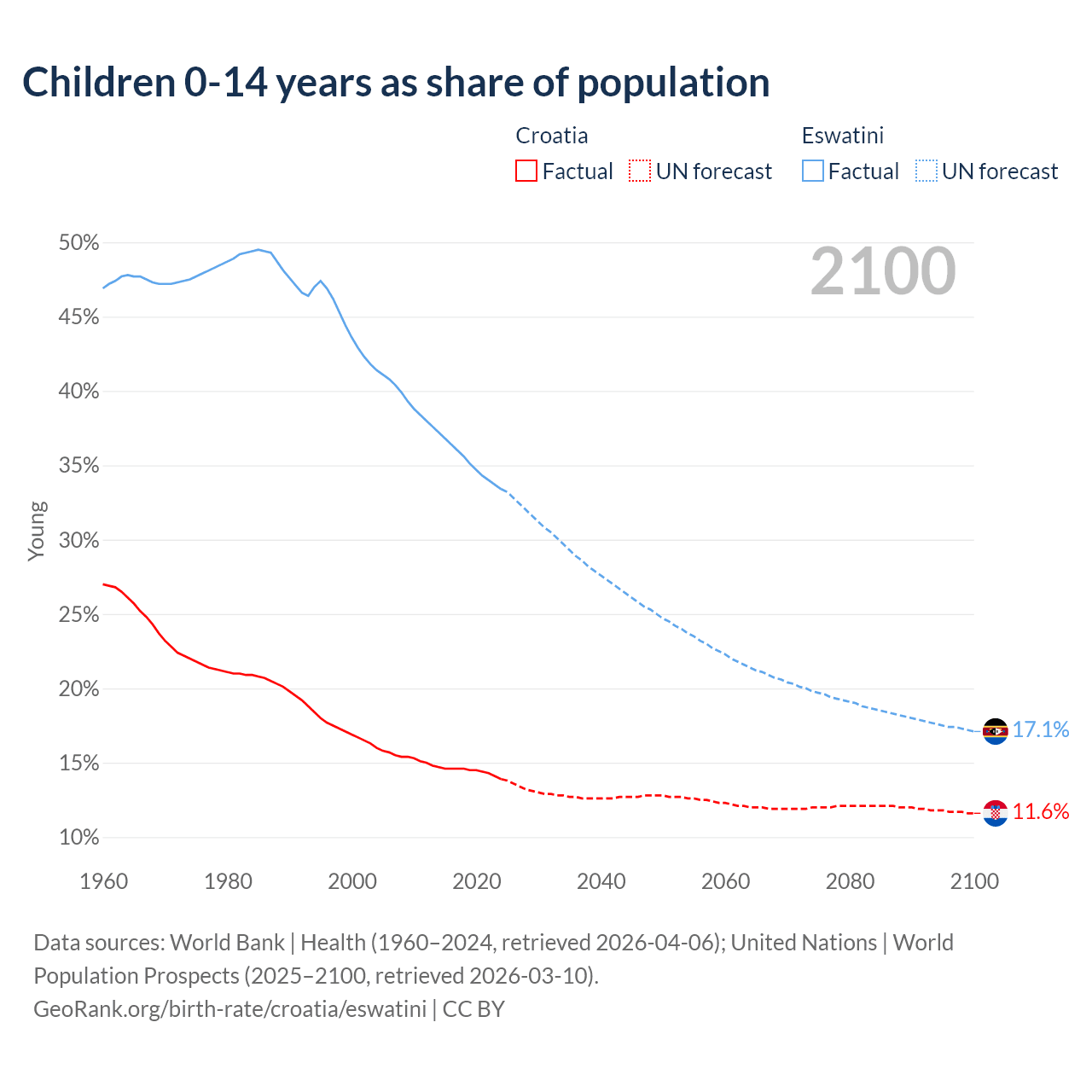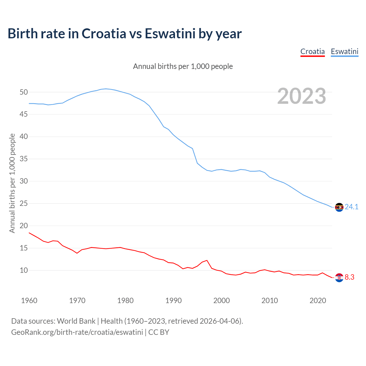 Croatia has an annual birth rate of 8.3 births per 1,000 people, compared to 24.1 for Eswatini. The average number of children a woman is expected to have during her lifetime — the fertility rate, is 1.46 in Croatia and 2.75 in Eswatini — 88.6% difference.