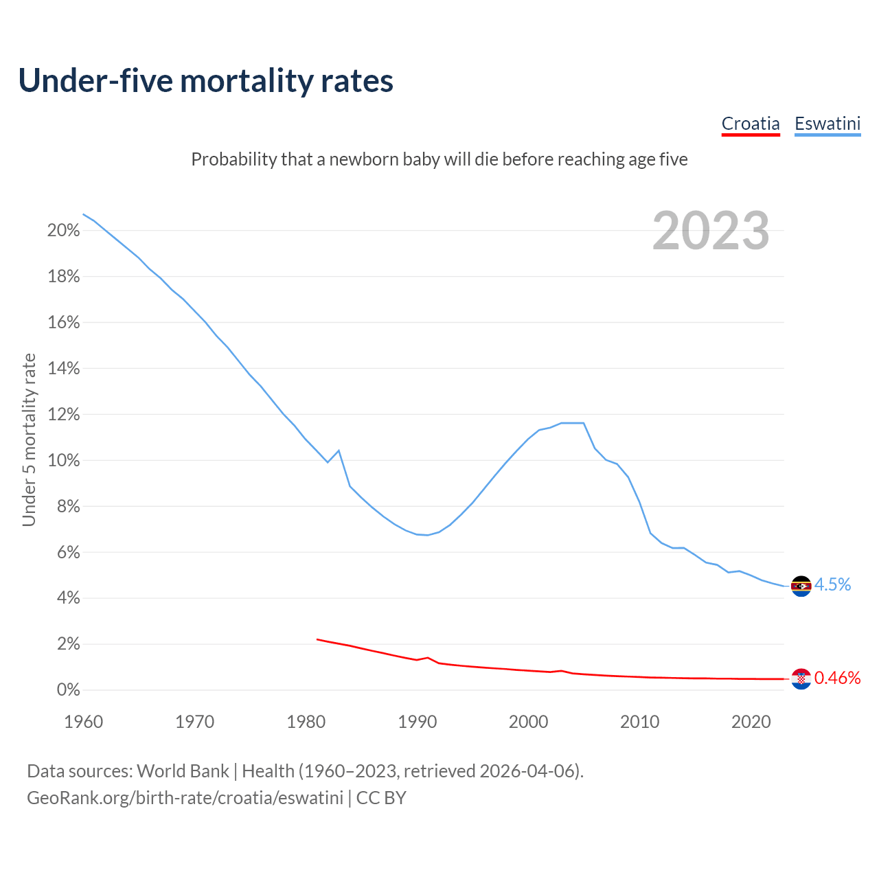 The chance that a newborn baby will die before reaching age five is 0.46% in Croatia and 4.5% in Eswatini. Above is a chart with historical data on under-five mortality rates.