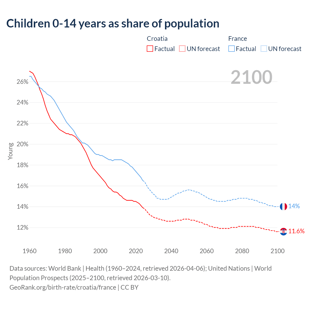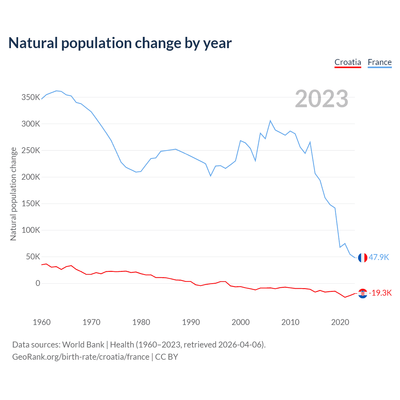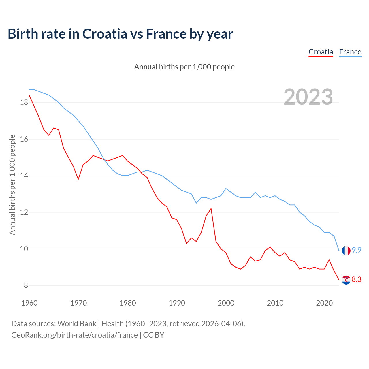 Croatia has an annual birth rate of 8.3 births per 1,000 people, compared to 9.9 for France. The average number of children a woman is expected to have during her lifetime — the fertility rate, is 1.46 in Croatia and 1.66 in France — 13.7% difference.