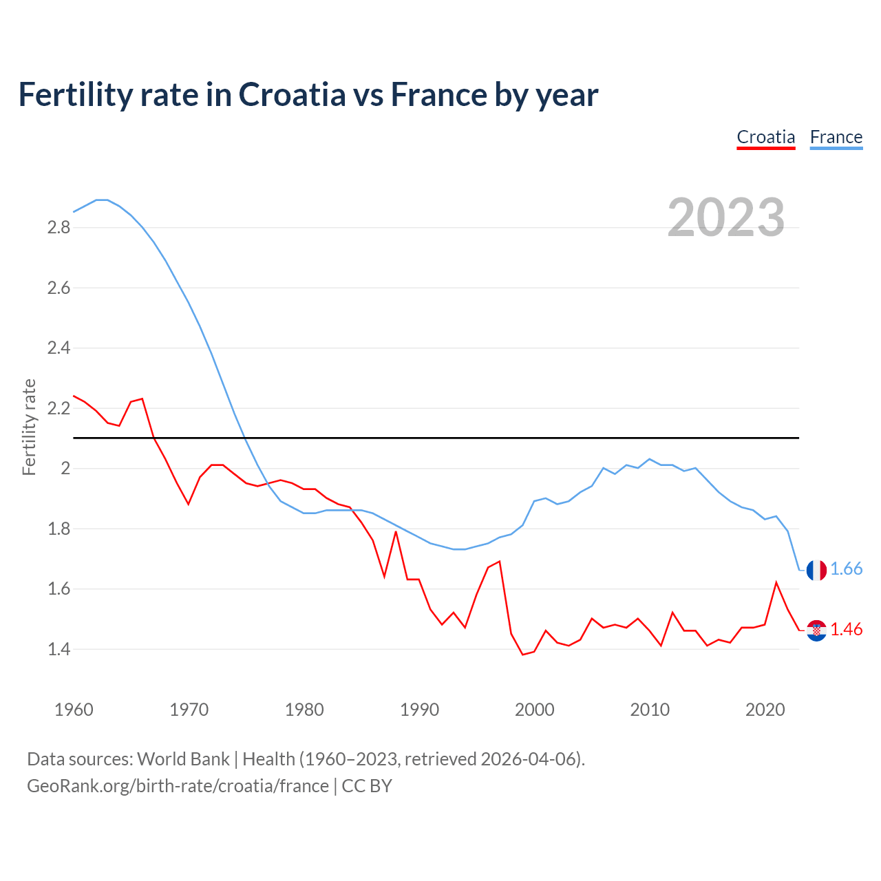According to the latest available data on birth rates, the fertility rate in Croatia was 1.46 children per woman in 2023, compared to 1.66 in France in 2023. The replacement level is considered to be 2.1 children per woman.