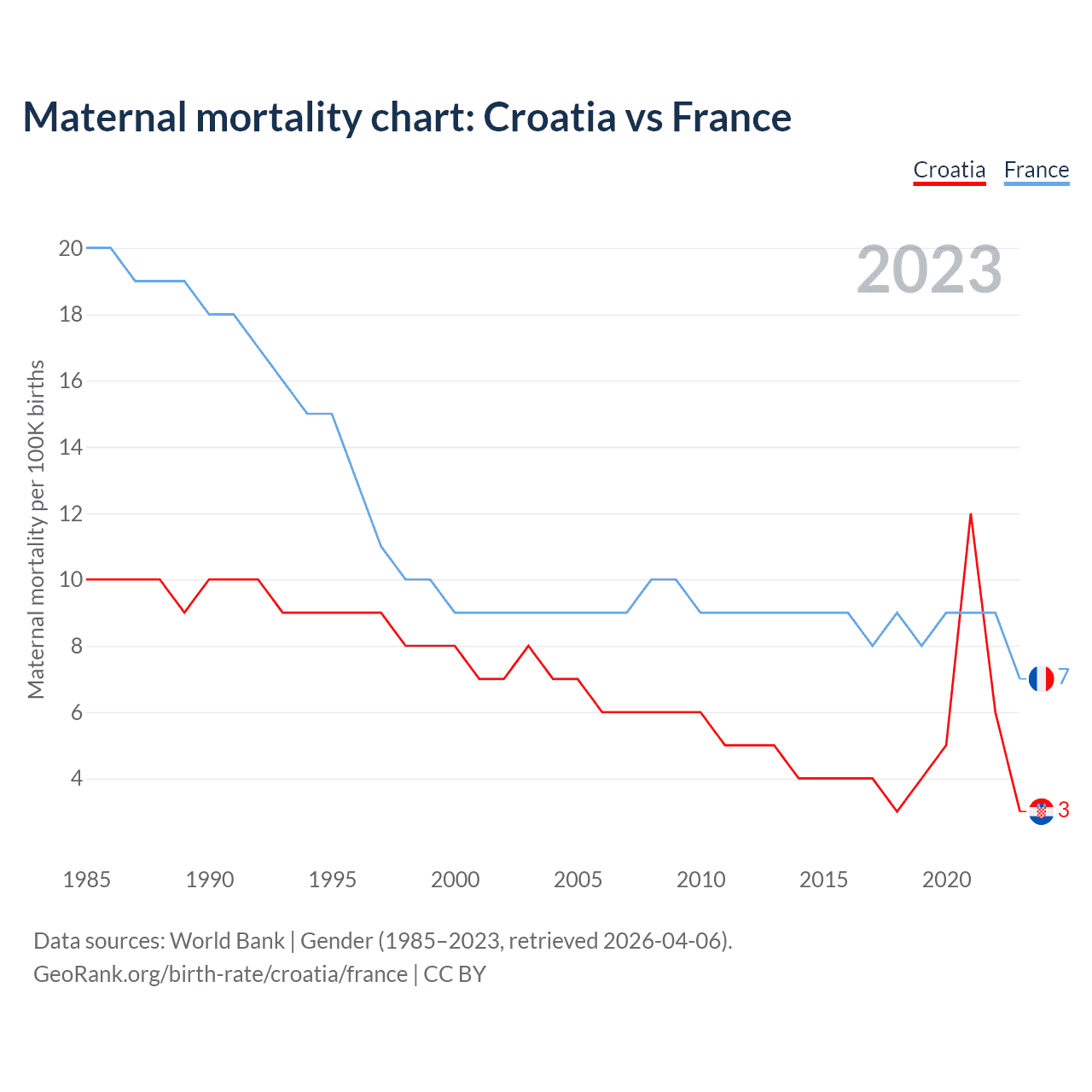 The maternal mortality rate, which is the probability of dying during childbirth or within 42 days of pregnancy termination, is 3 deaths per 100,000 live births in Croatia, compared to 7 deaths in France.