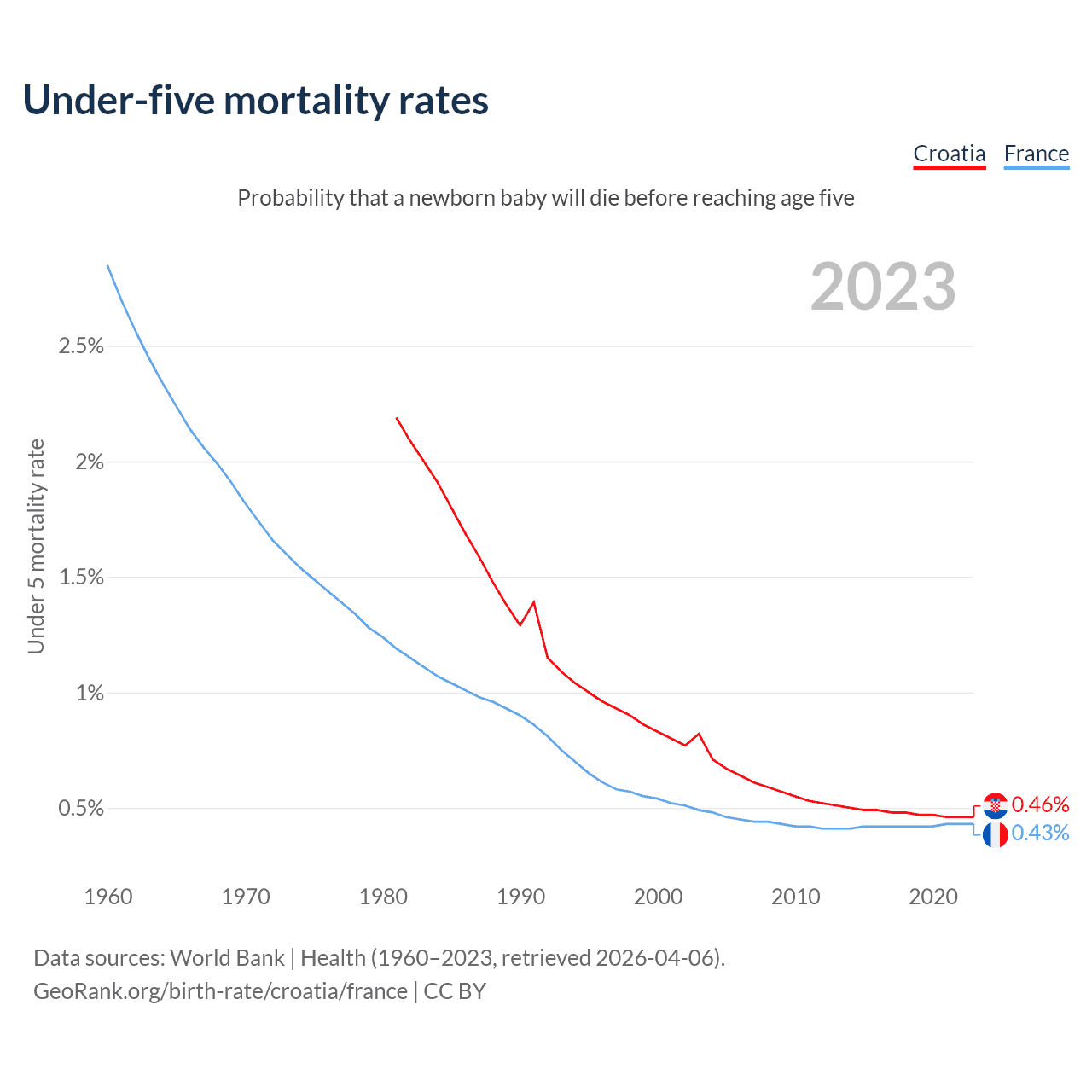 The chance that a newborn baby will die before reaching age five is 0.46% in Croatia and 0.43% in France. Above is a chart with historical data on under-five mortality rates.