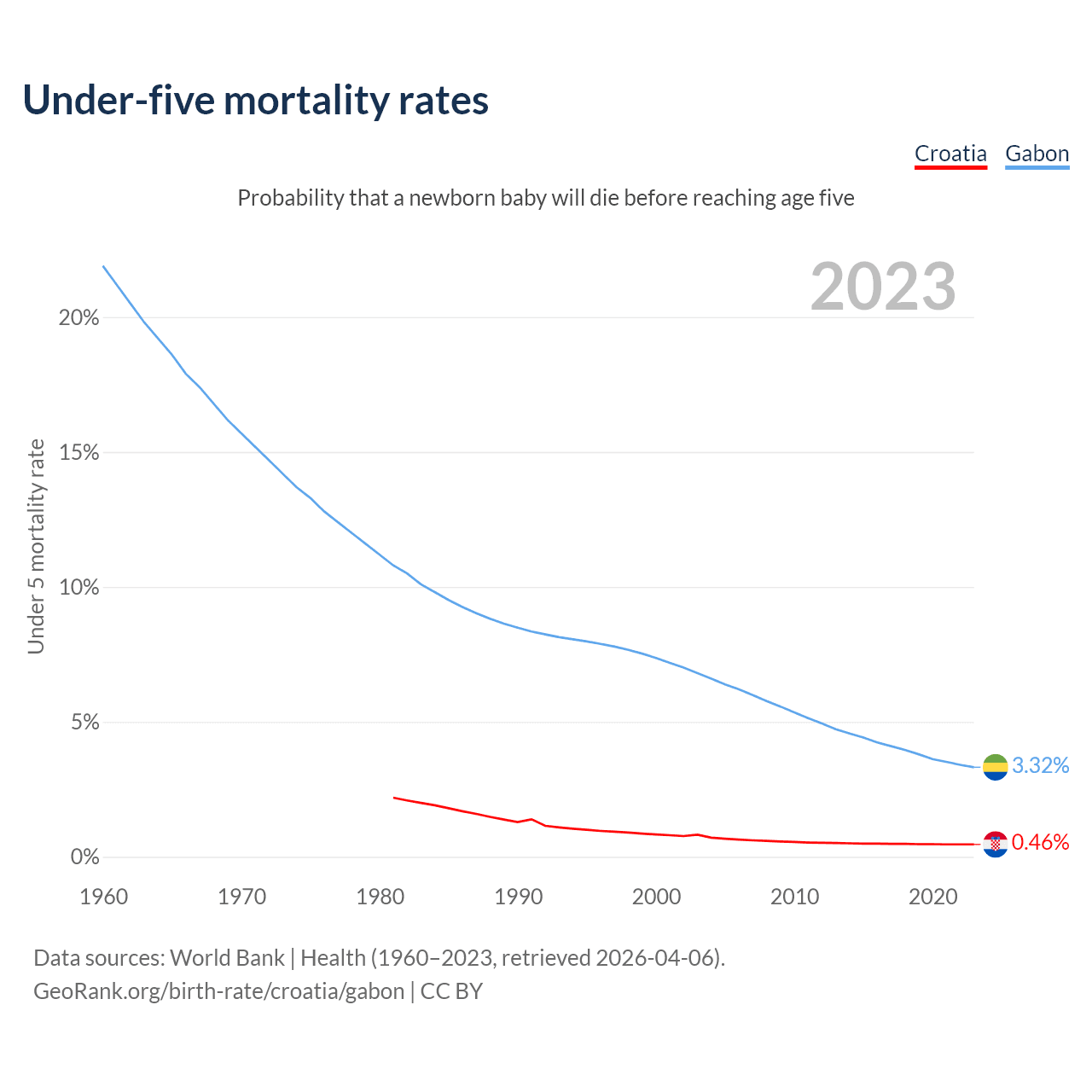 The chance that a newborn baby will die before reaching age five is 0.46% in Croatia and 3.32% in Gabon. Above is a chart with historical data on under-five mortality rates.
