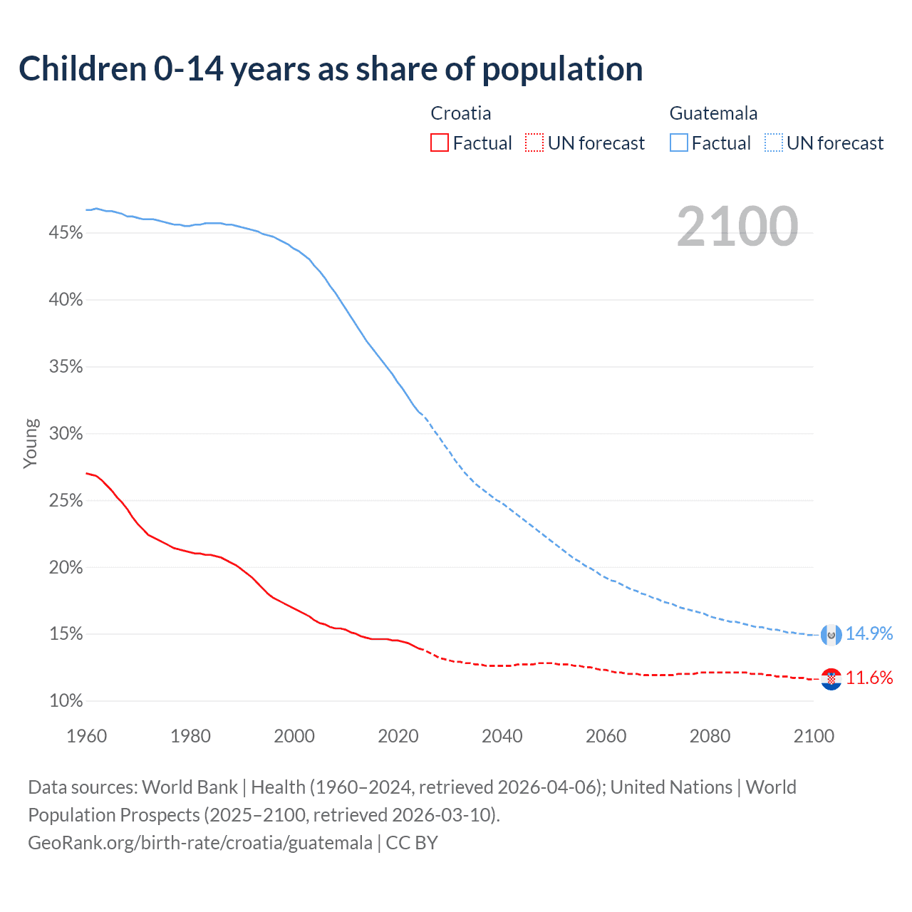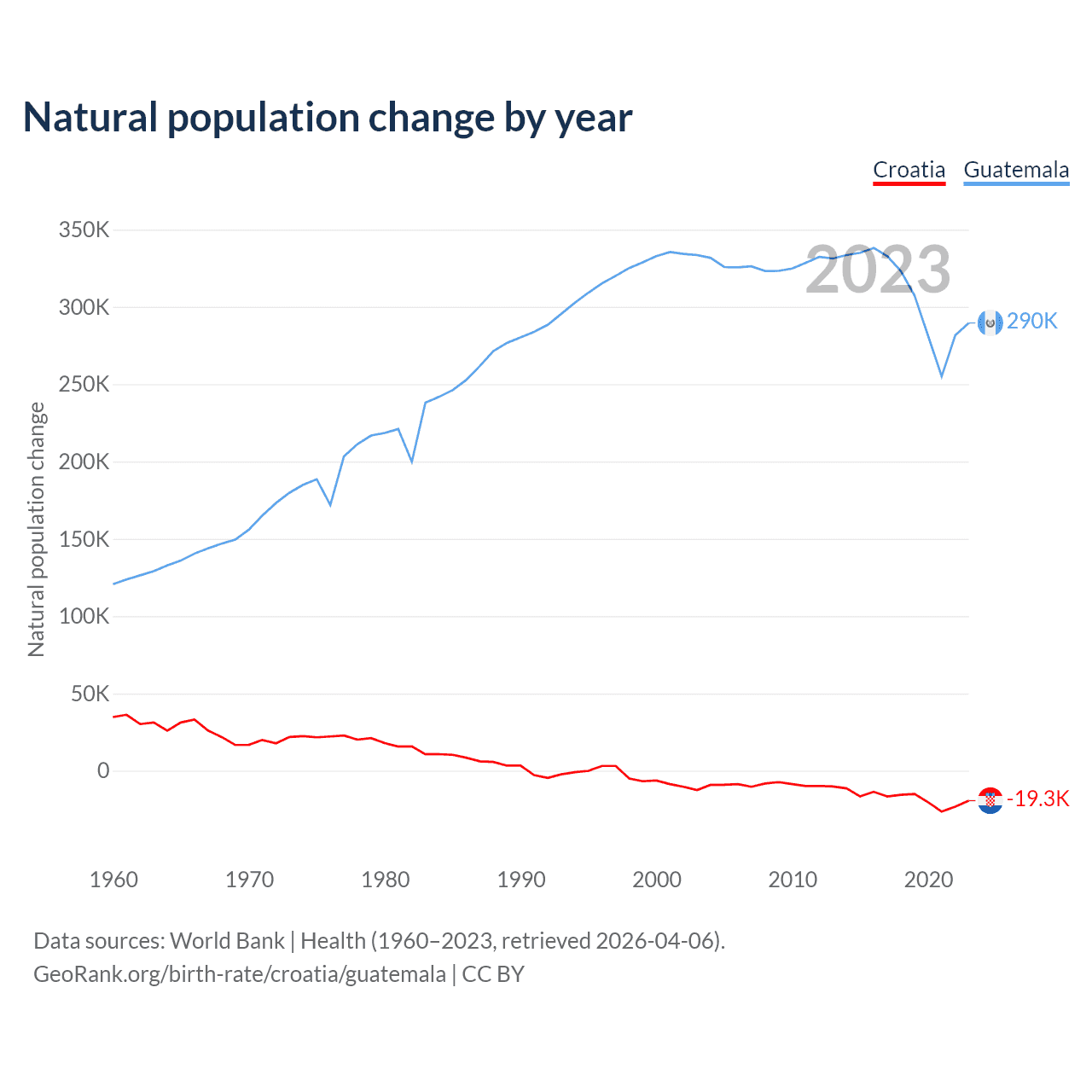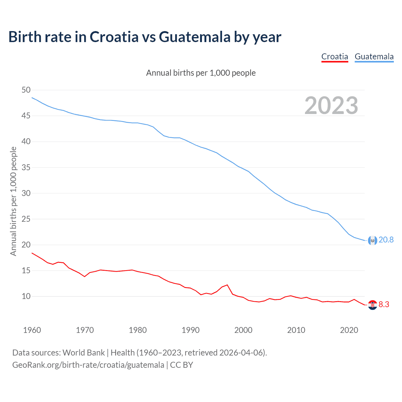Croatia has an annual birth rate of 8.3 births per 1,000 people, compared to 20.8 for Guatemala. The average number of children a woman is expected to have during her lifetime — the fertility rate, is 1.46 in Croatia and 2.31 in Guatemala — 58.3% difference.