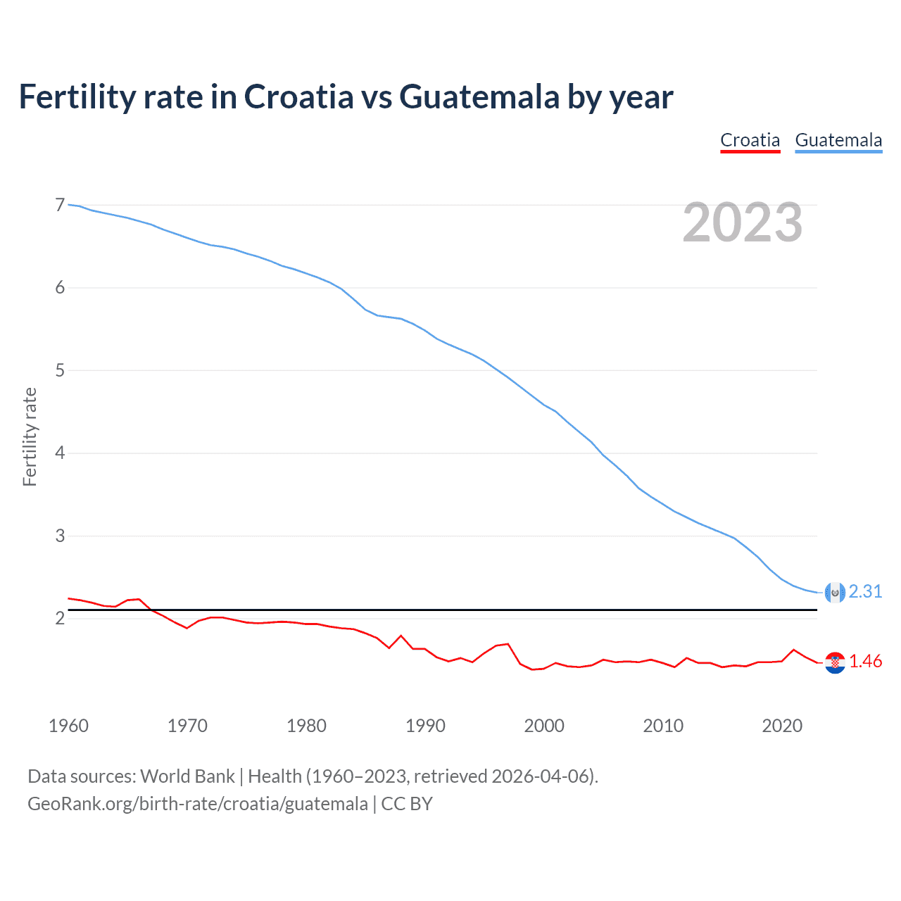 According to the latest available data on birth rates, the fertility rate in Croatia was 1.46 children per woman in 2023, compared to 2.31 in Guatemala in 2023. The replacement level is considered to be 2.1 children per woman.
