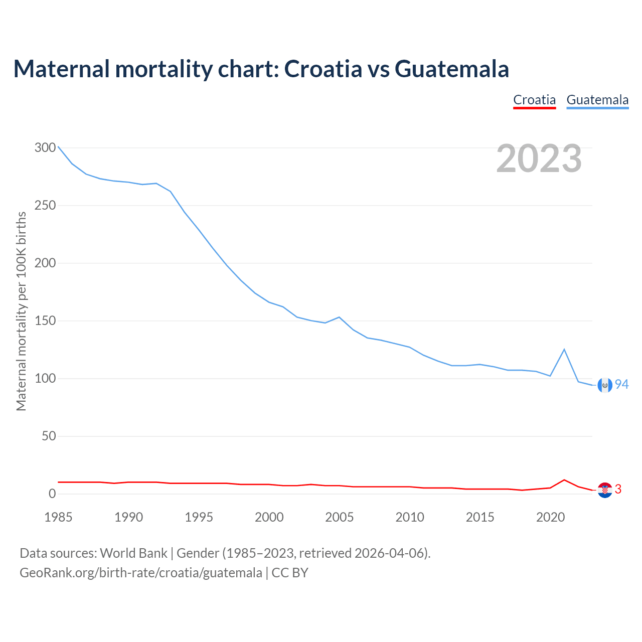 The maternal mortality rate, which is the probability of dying during childbirth or within 42 days of pregnancy termination, is 3 deaths per 100,000 live births in Croatia, compared to 94 deaths in Guatemala.