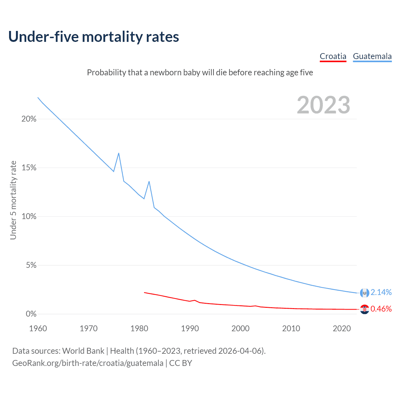 The chance that a newborn baby will die before reaching age five is 0.46% in Croatia and 2.14% in Guatemala. Above is a chart with historical data on under-five mortality rates.