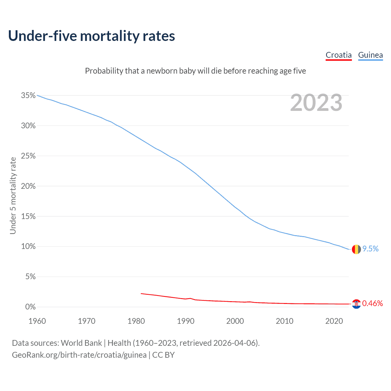 The chance that a newborn baby will die before reaching age five is 0.46% in Croatia and 9.5% in Guinea. Above is a chart with historical data on under-five mortality rates.