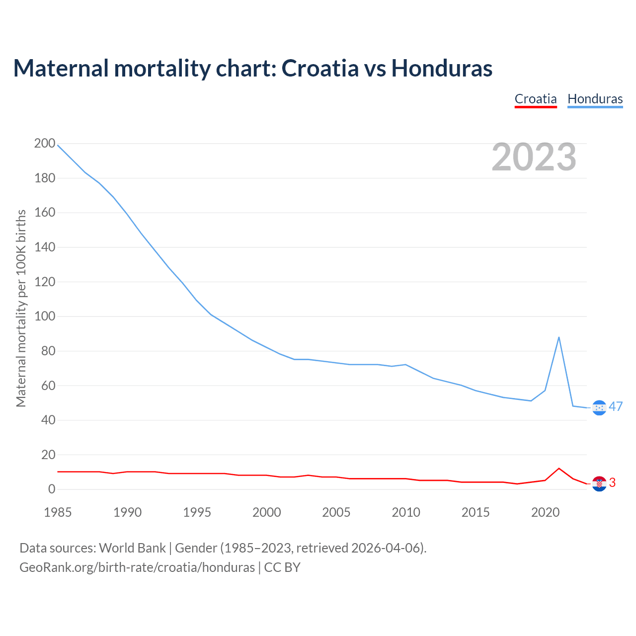 The maternal mortality rate, which is the probability of dying during childbirth or within 42 days of pregnancy termination, is 3 deaths per 100,000 live births in Croatia, compared to 47 deaths in Honduras.