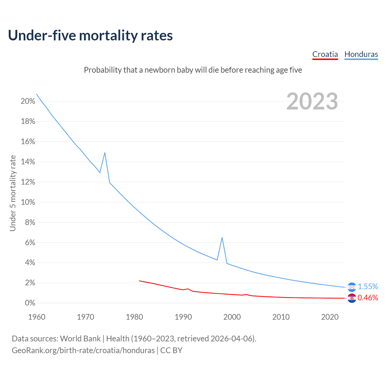 The chance that a newborn baby will die before reaching age five is 0.46% in Croatia and 1.55% in Honduras. Above is a chart with historical data on under-five mortality rates.
