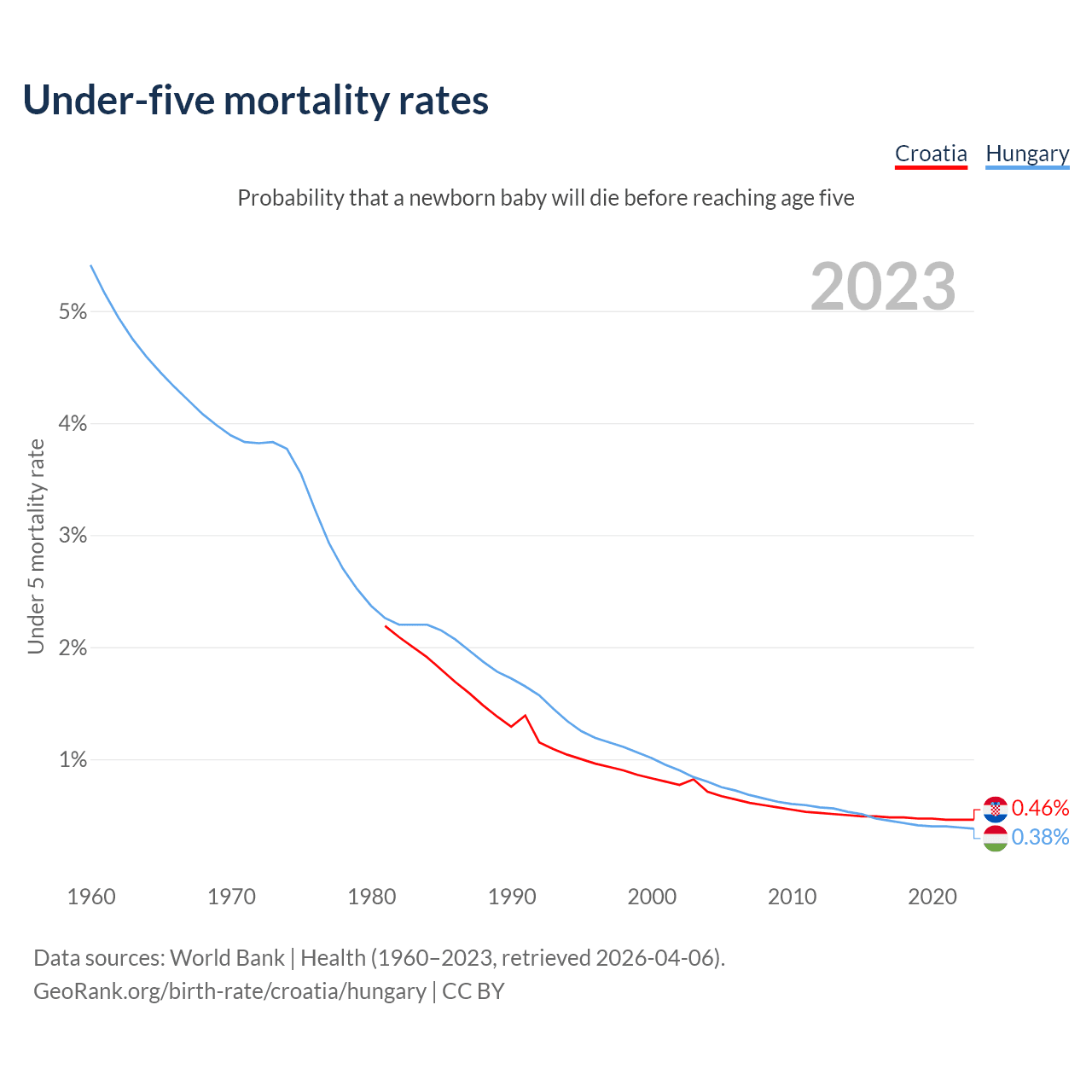 The chance that a newborn baby will die before reaching age five is 0.46% in Croatia and 0.38% in Hungary. Above is a chart with historical data on under-five mortality rates.