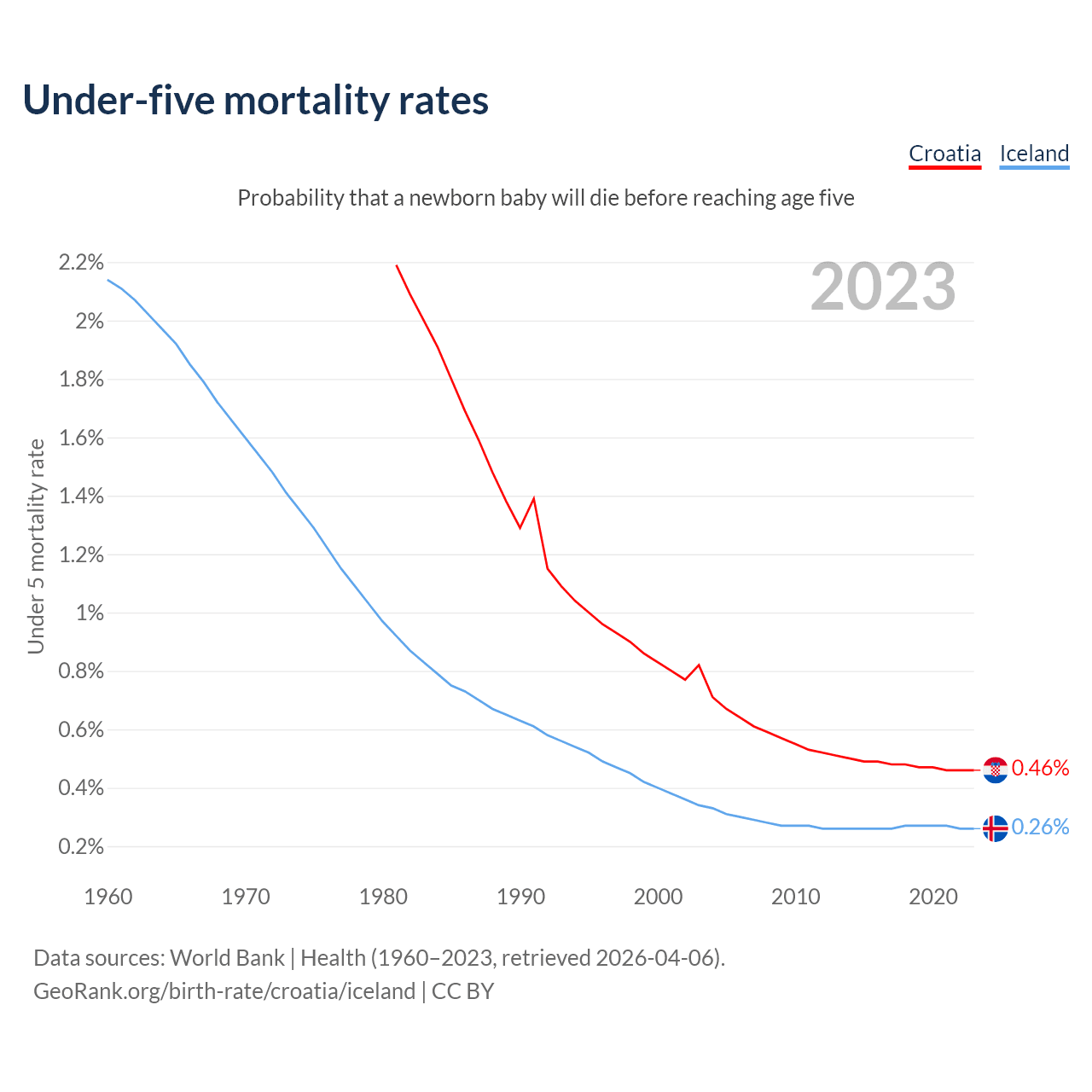 The chance that a newborn baby will die before reaching age five is 0.46% in Croatia and 0.26% in Iceland. Above is a chart with historical data on under-five mortality rates.