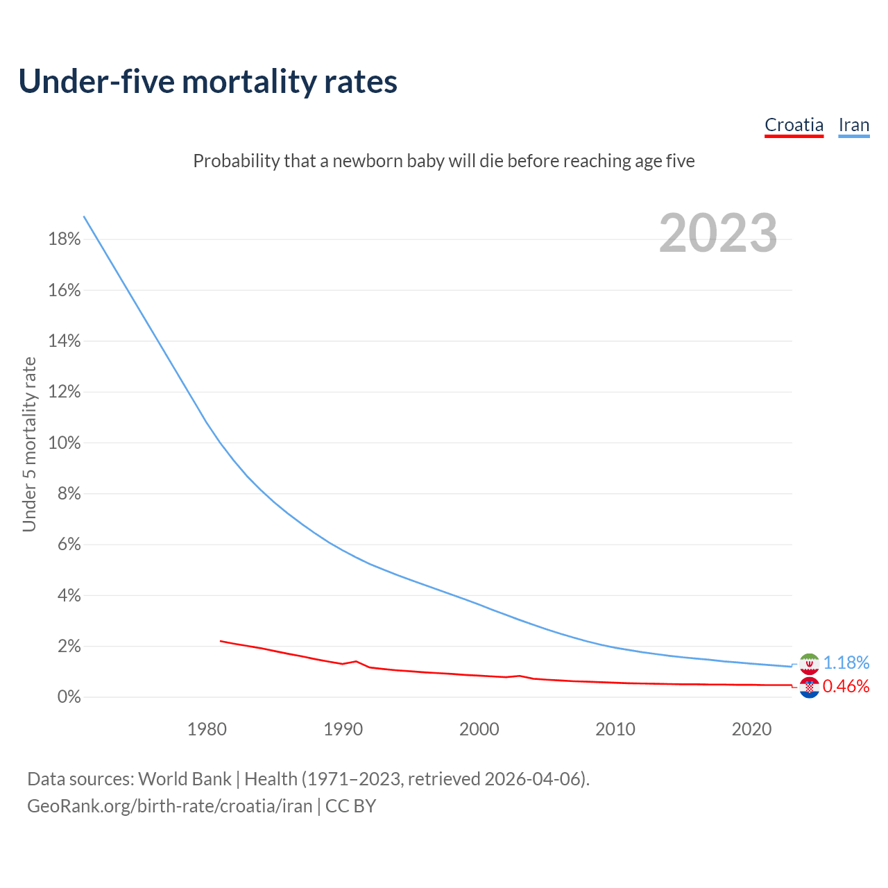 The chance that a newborn baby will die before reaching age five is 0.46% in Croatia and 1.18% in Iran. Above is a chart with historical data on under-five mortality rates.