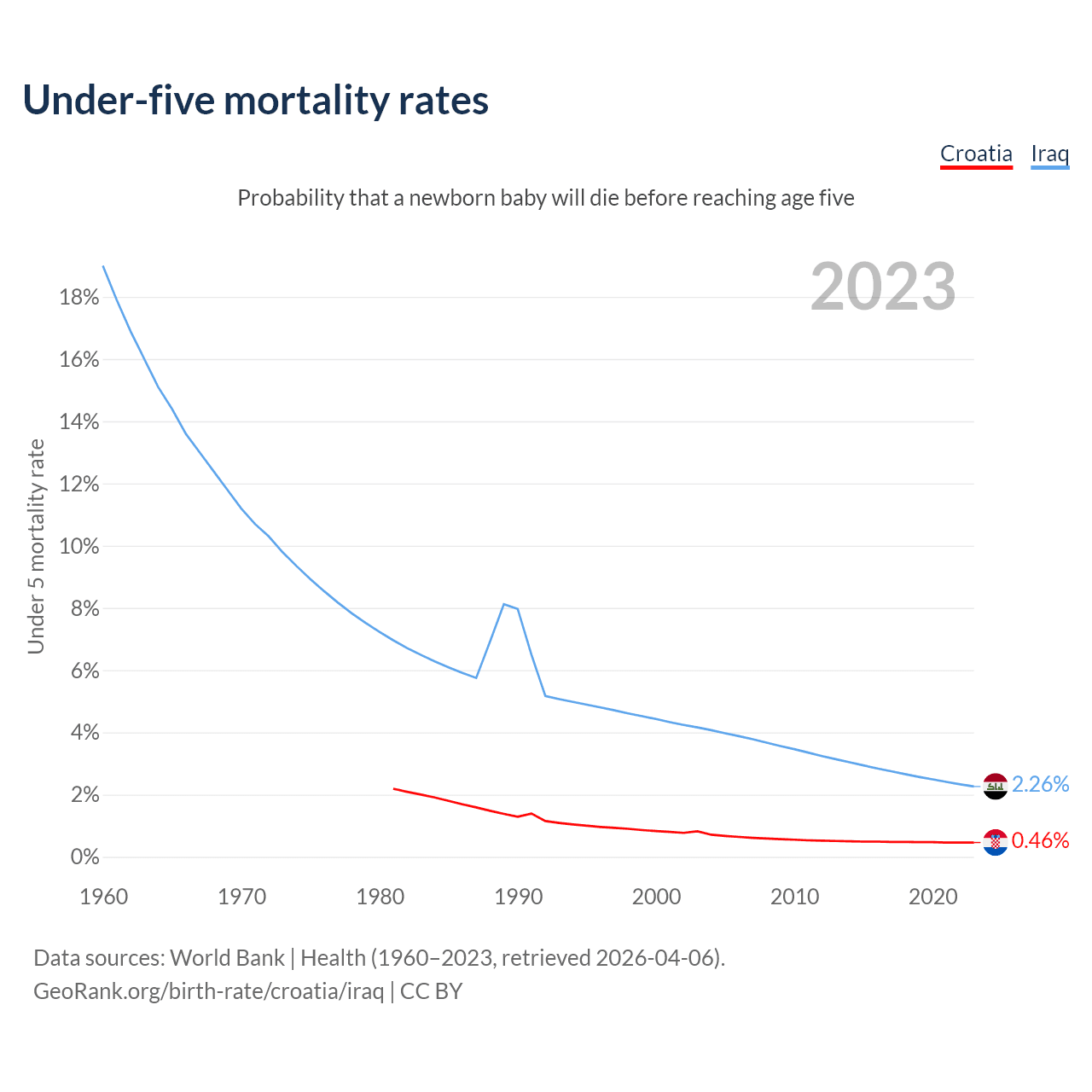 The chance that a newborn baby will die before reaching age five is 0.46% in Croatia and 2.26% in Iraq. Above is a chart with historical data on under-five mortality rates.