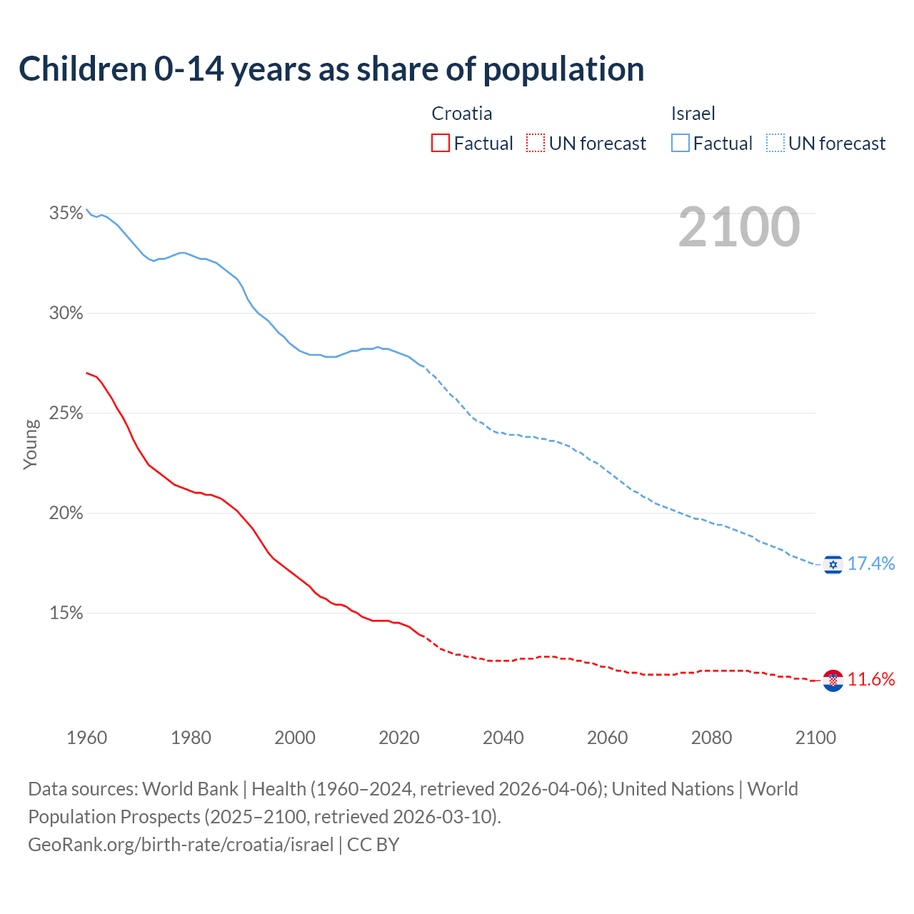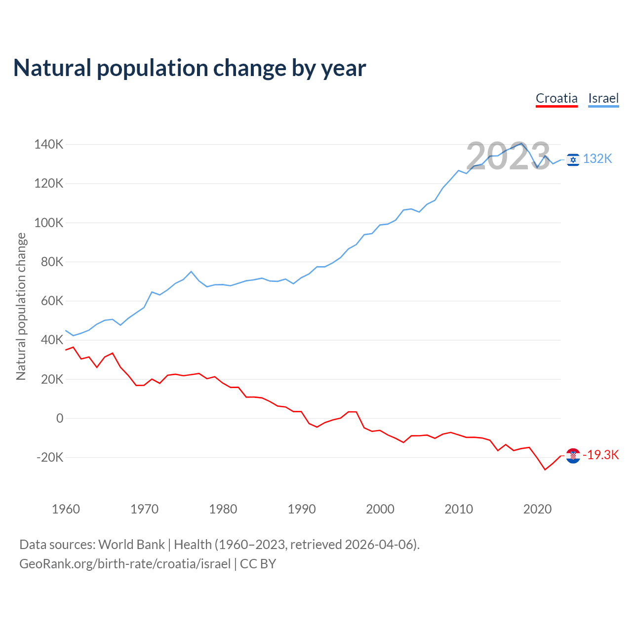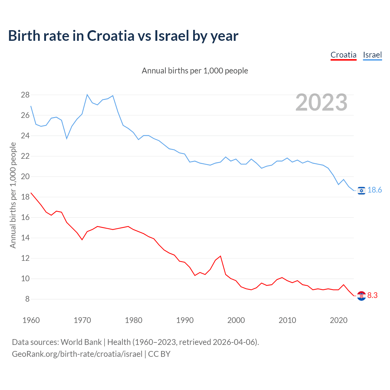 Croatia has an annual birth rate of 8.3 births per 1,000 people, compared to 18.6 for Israel. The average number of children a woman is expected to have during her lifetime — the fertility rate, is 1.46 in Croatia and 2.85 in Israel — 95.2% difference.