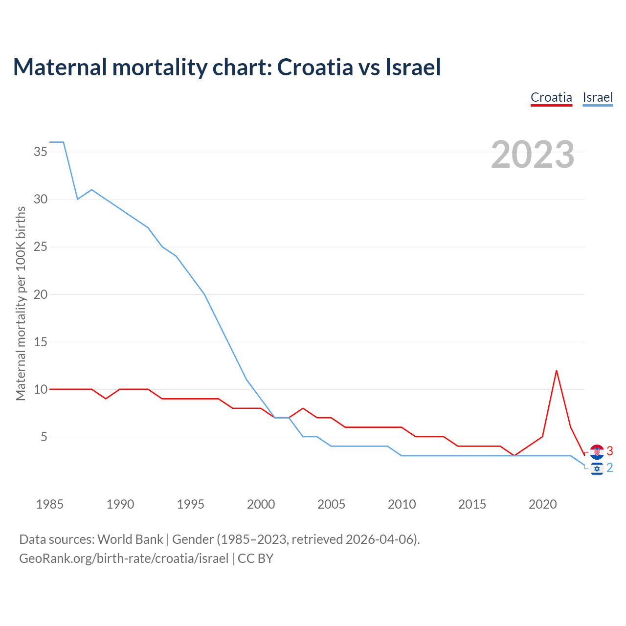 The maternal mortality rate, which is the probability of dying during childbirth or within 42 days of pregnancy termination, is 3 deaths per 100,000 live births in Croatia, compared to 2 deaths in Israel.