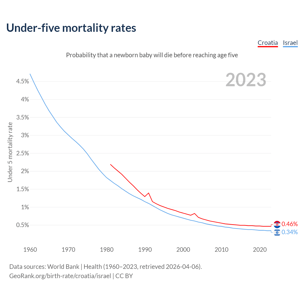 The chance that a newborn baby will die before reaching age five is 0.46% in Croatia and 0.34% in Israel. Above is a chart with historical data on under-five mortality rates.