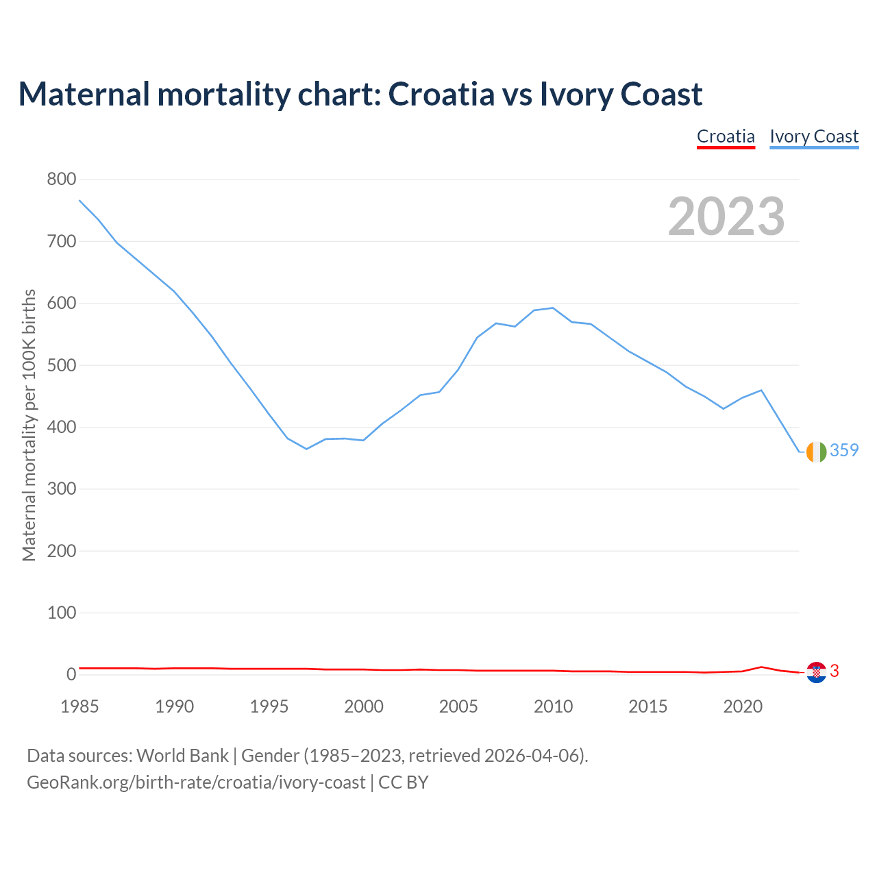 The maternal mortality rate, which is the probability of dying during childbirth or within 42 days of pregnancy termination, is 3 deaths per 100,000 live births in Croatia, compared to 359 deaths in Ivory Coast.