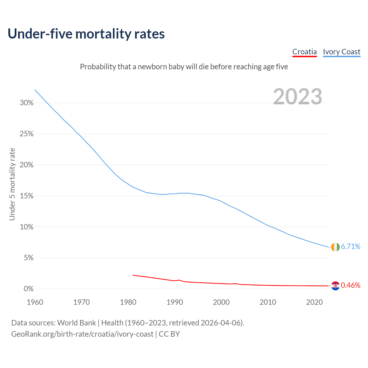 The chance that a newborn baby will die before reaching age five is 0.46% in Croatia and 6.71% in Ivory Coast. Above is a chart with historical data on under-five mortality rates.