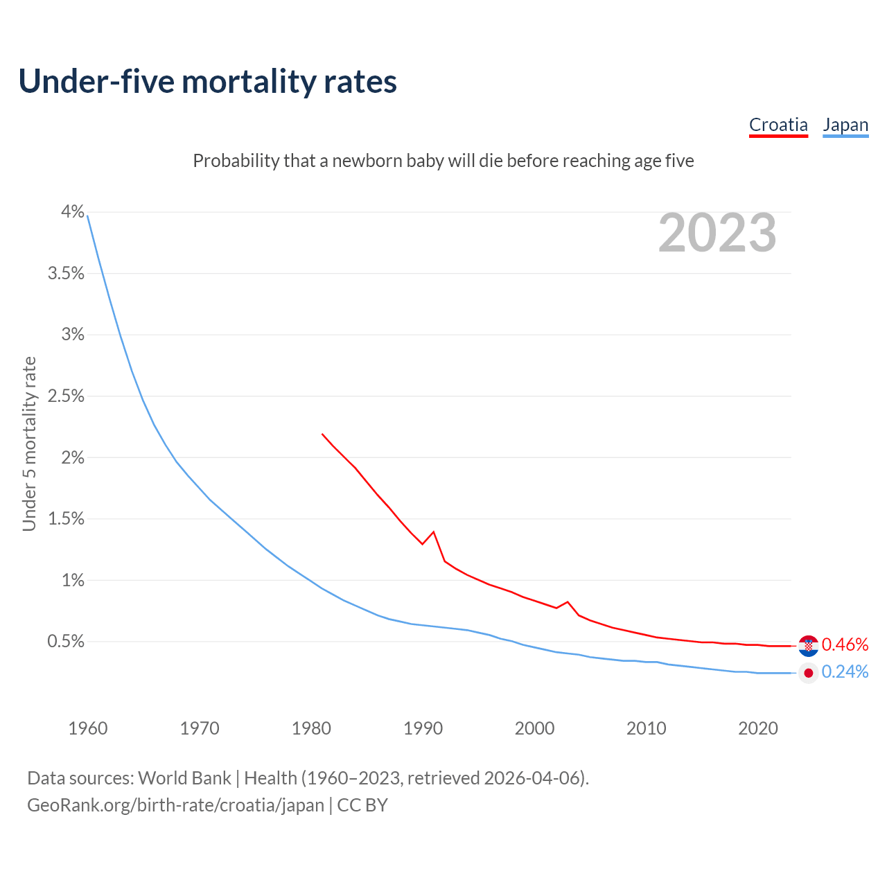 The chance that a newborn baby will die before reaching age five is 0.46% in Croatia and 0.24% in Japan. Above is a chart with historical data on under-five mortality rates.