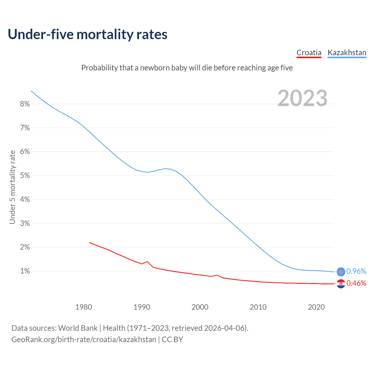 The chance that a newborn baby will die before reaching age five is 0.46% in Croatia and 0.96% in Kazakhstan. Above is a chart with historical data on under-five mortality rates.