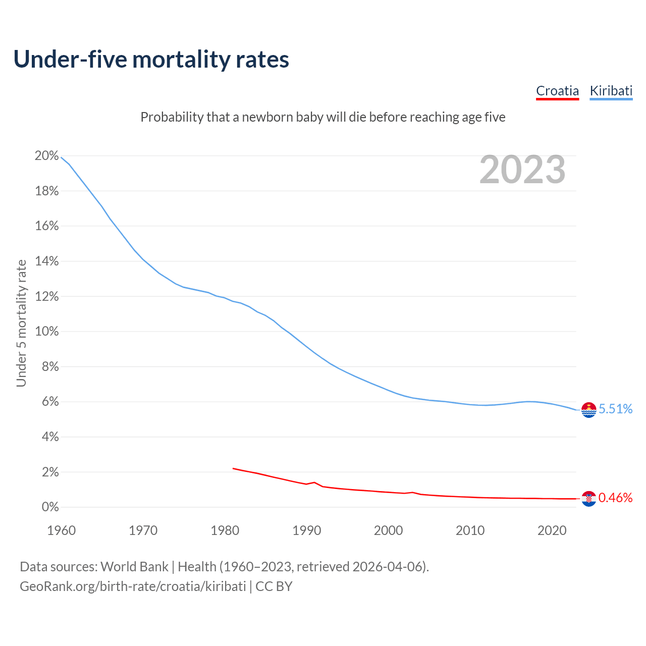 The chance that a newborn baby will die before reaching age five is 0.46% in Croatia and 5.51% in Kiribati. Above is a chart with historical data on under-five mortality rates.