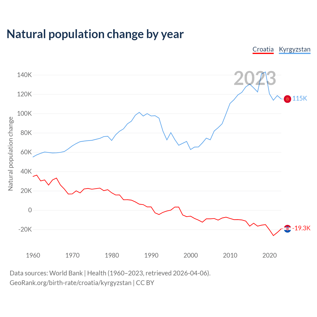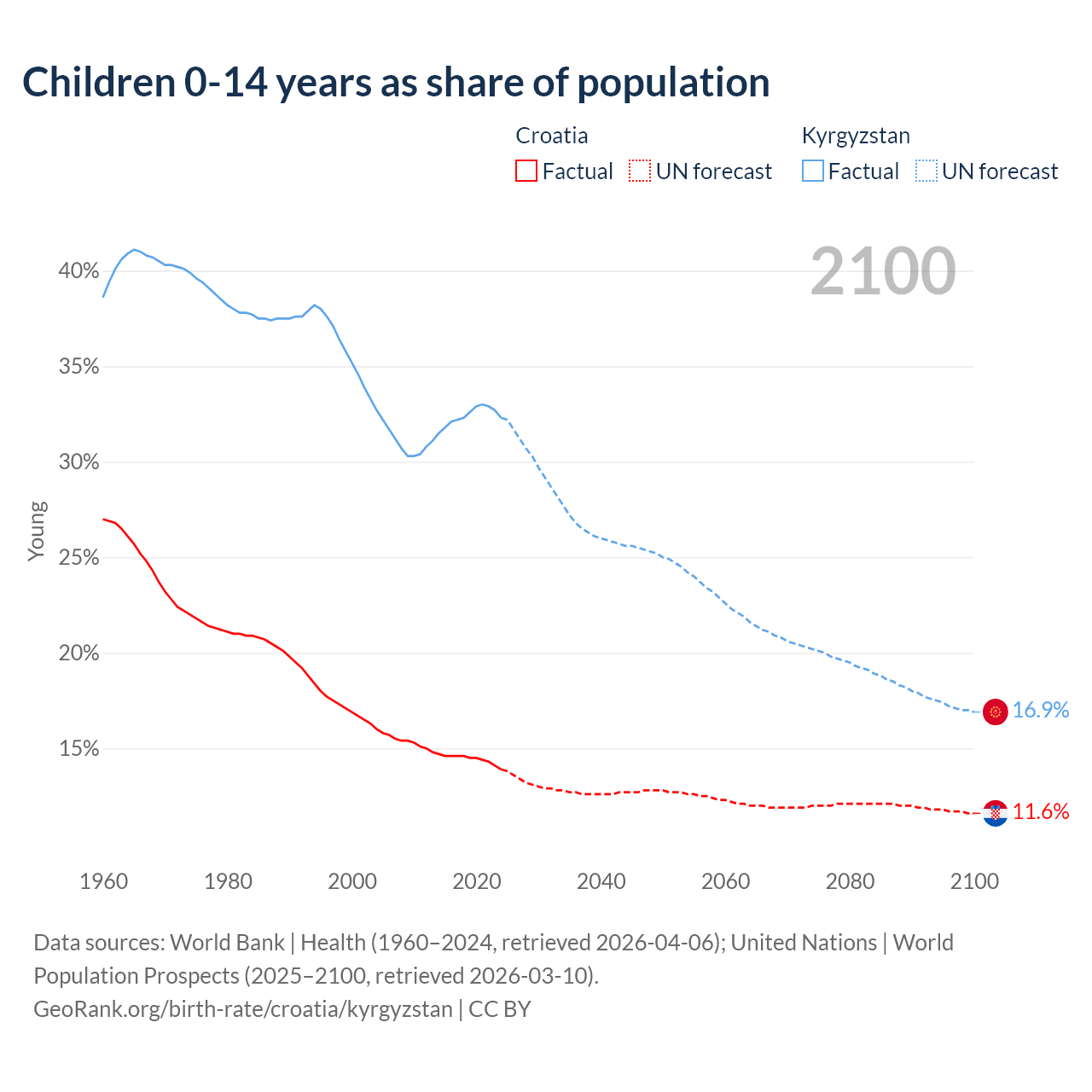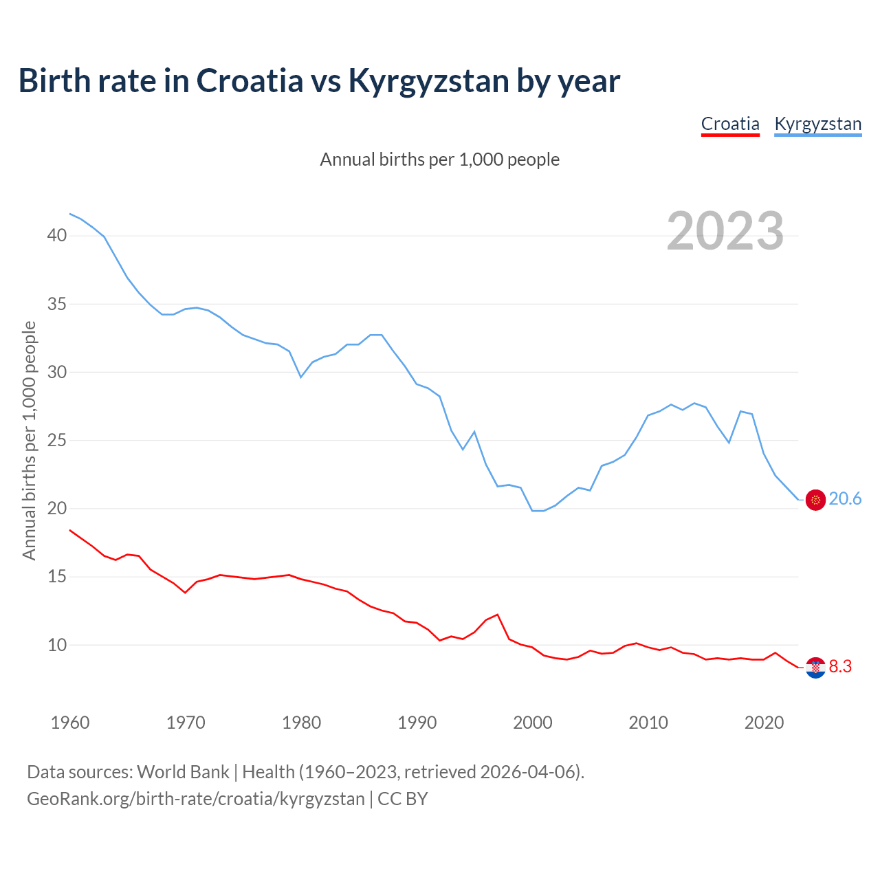 Croatia has an annual birth rate of 8.3 births per 1,000 people, compared to 20.6 for Kyrgyzstan. The average number of children a woman is expected to have during her lifetime — the fertility rate, is 1.46 in Croatia and 2.7 in Kyrgyzstan — 84.9% difference.