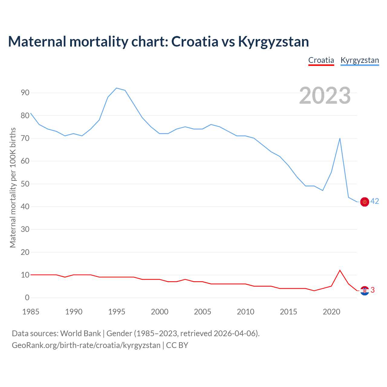 The maternal mortality rate, which is the probability of dying during childbirth or within 42 days of pregnancy termination, is 3 deaths per 100,000 live births in Croatia, compared to 42 deaths in Kyrgyzstan.