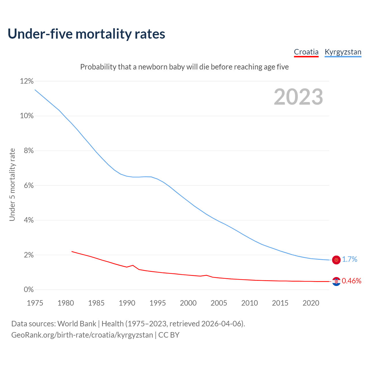 The chance that a newborn baby will die before reaching age five is 0.46% in Croatia and 1.7% in Kyrgyzstan. Above is a chart with historical data on under-five mortality rates.
