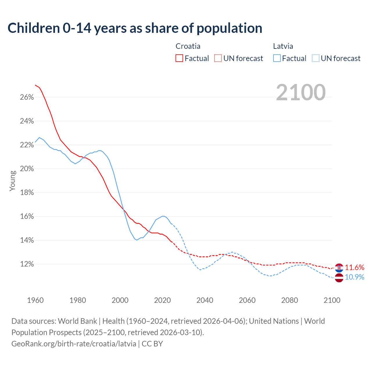 According to the latest available data on birth rates, the fertility rate in Croatia was 1.46 children per woman in 2023, compared to 1.36 in Latvia in 2023. The replacement level is considered to be 2.1 children per woman.
