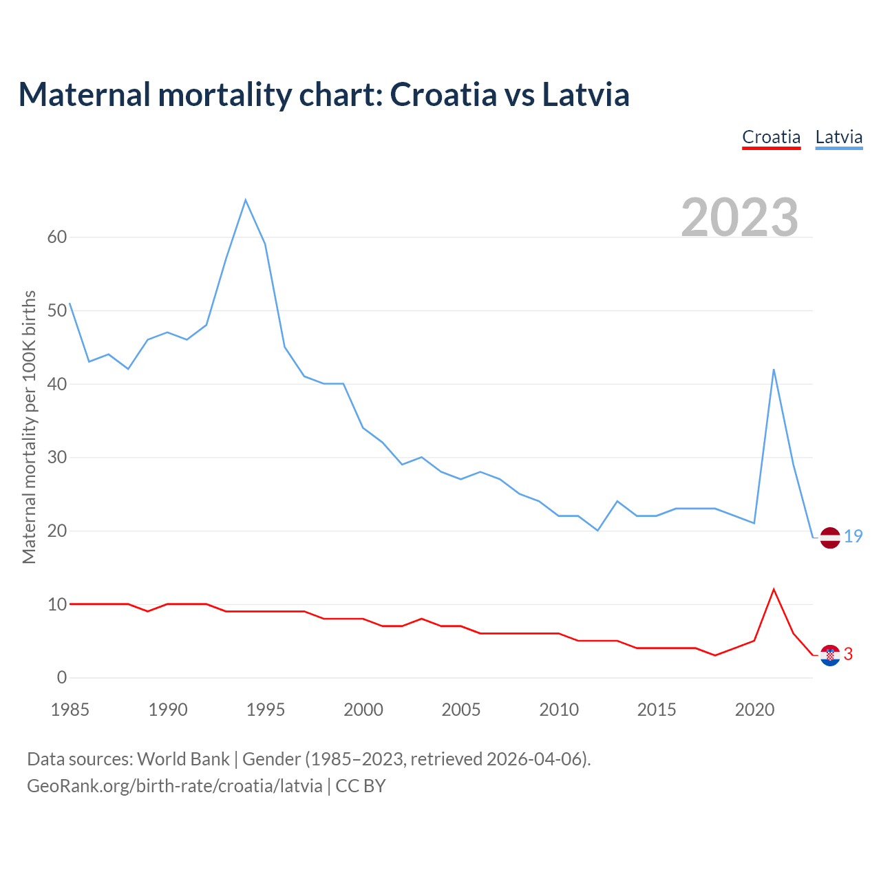 The maternal mortality rate, which is the probability of dying during childbirth or within 42 days of pregnancy termination, is 3 deaths per 100,000 live births in Croatia, compared to 19 deaths in Latvia.