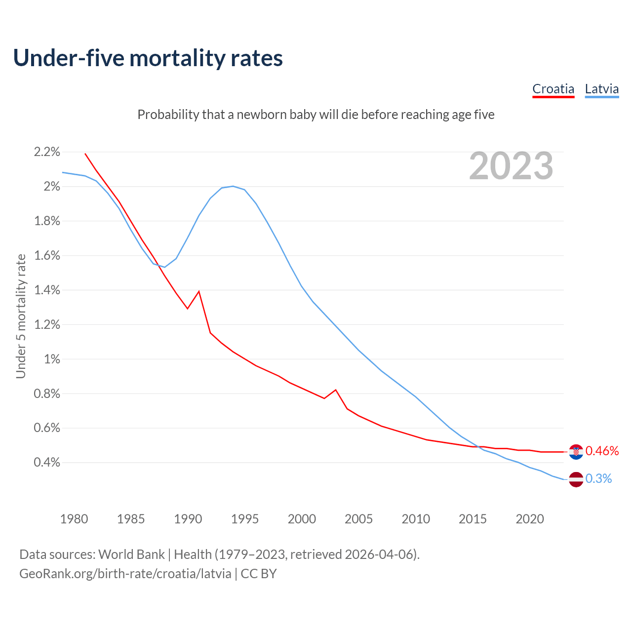 The chance that a newborn baby will die before reaching age five is 0.46% in Croatia and 0.3% in Latvia. Above is a chart with historical data on under-five mortality rates.