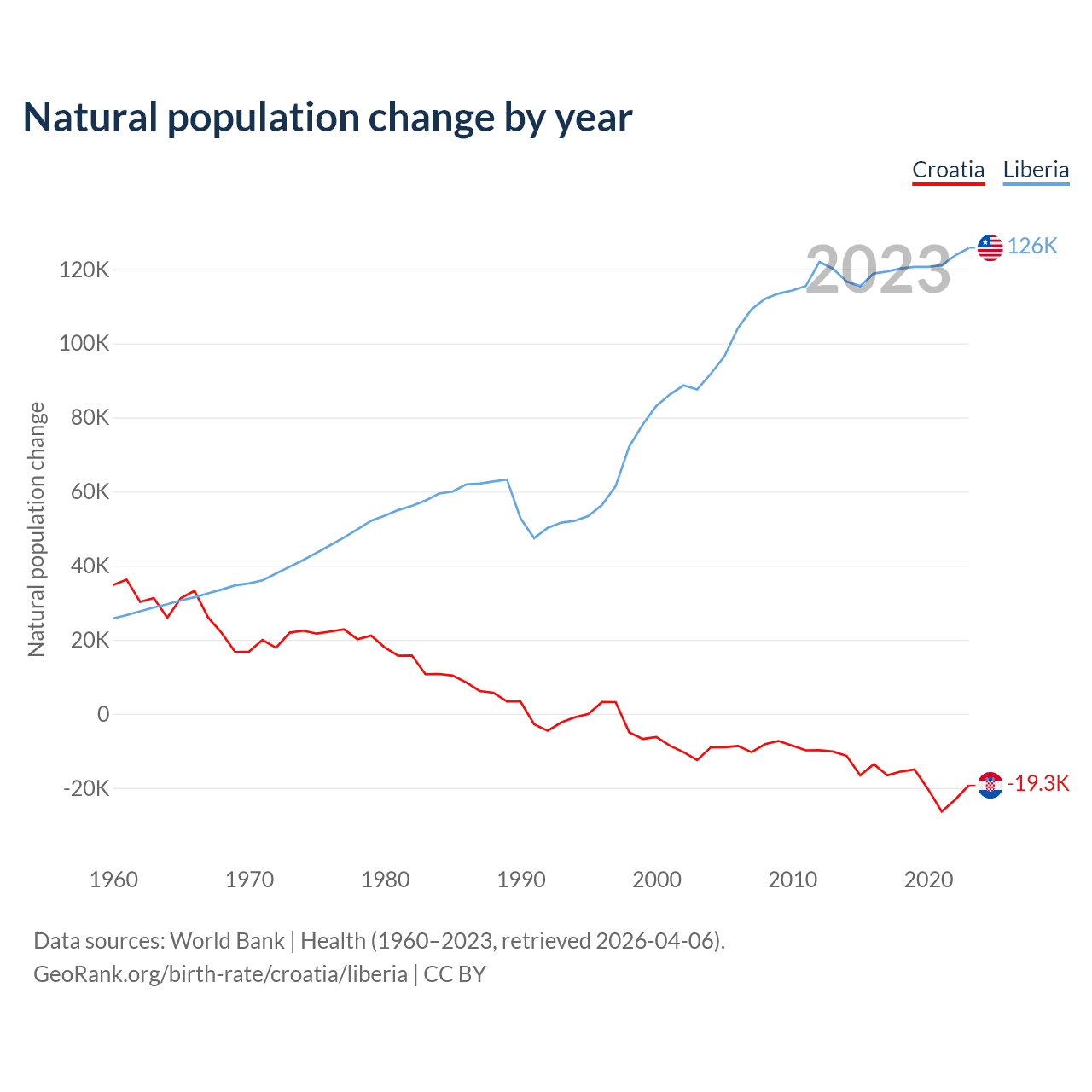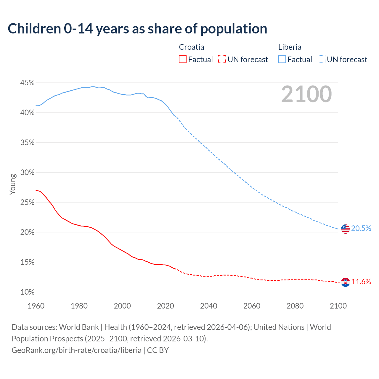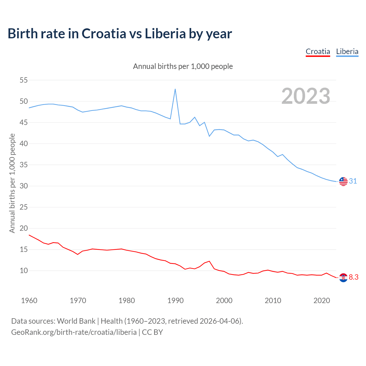 Croatia has an annual birth rate of 8.3 births per 1,000 people, compared to 31 for Liberia. The average number of children a woman is expected to have during her lifetime — the fertility rate, is 1.46 in Croatia and 3.95 in Liberia — 170.5% difference.