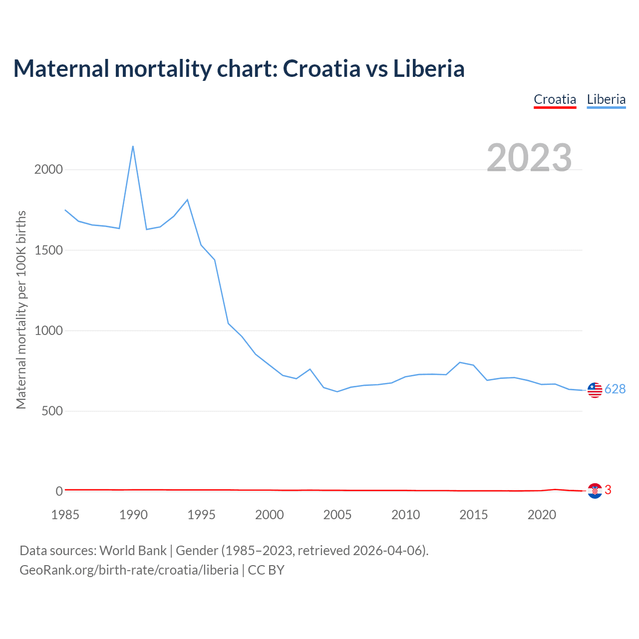 The maternal mortality rate, which is the probability of dying during childbirth or within 42 days of pregnancy termination, is 3 deaths per 100,000 live births in Croatia, compared to 628 deaths in Liberia.