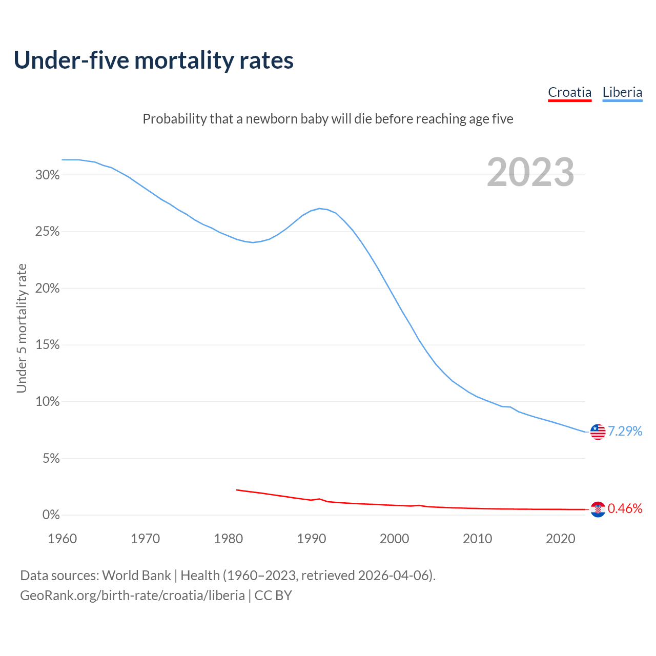 The chance that a newborn baby will die before reaching age five is 0.46% in Croatia and 7.29% in Liberia. Above is a chart with historical data on under-five mortality rates.