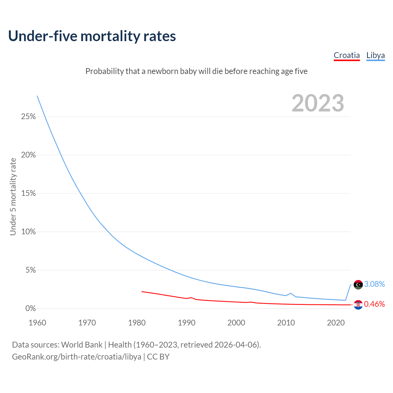 The chance that a newborn baby will die before reaching age five is 0.46% in Croatia and 3.08% in Libya. Above is a chart with historical data on under-five mortality rates.