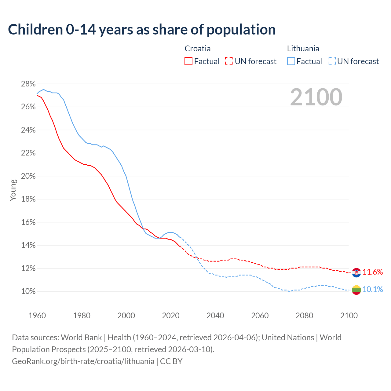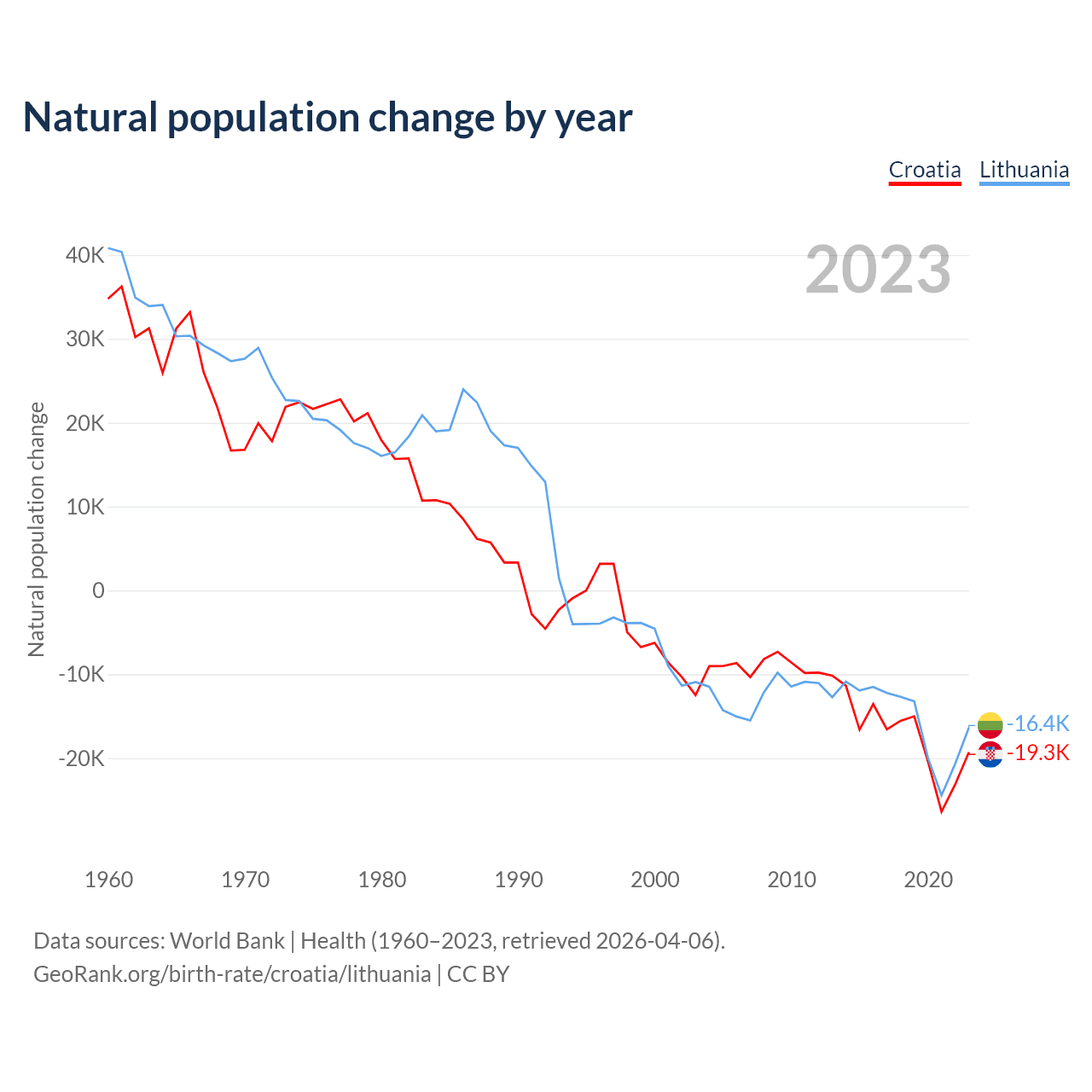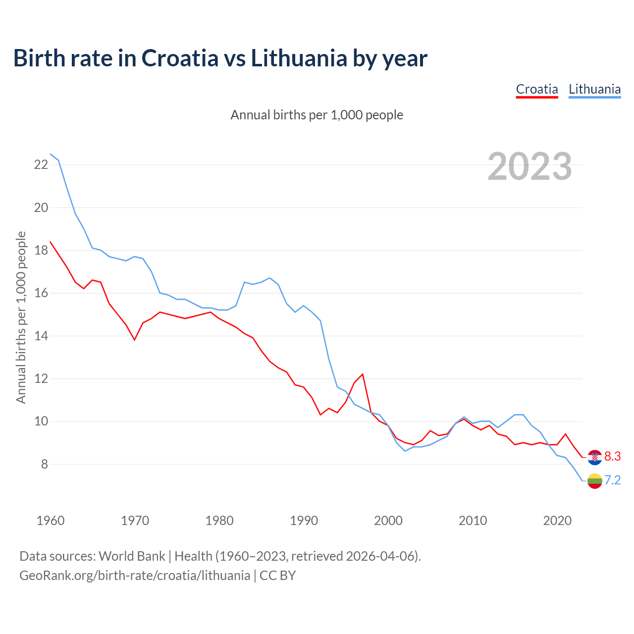 Croatia has an annual birth rate of 8.3 births per 1,000 people, compared to 7.2 for Lithuania. The average number of children a woman is expected to have during her lifetime — the fertility rate, is 1.46 in Croatia and 1.18 in Lithuania — 19.2% difference.