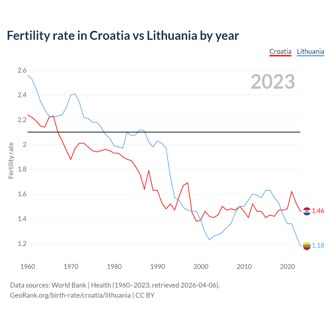 According to the latest available data on birth rates, the fertility rate in Croatia was 1.46 children per woman in 2023, compared to 1.18 in Lithuania in 2023. The replacement level is considered to be 2.1 children per woman.